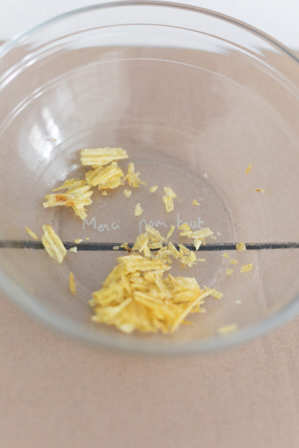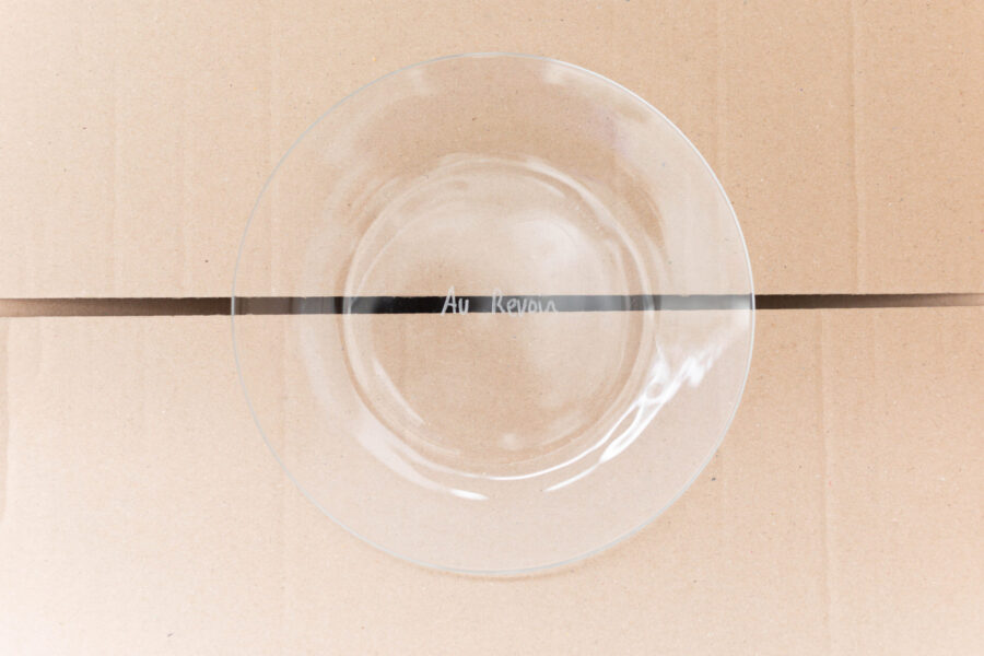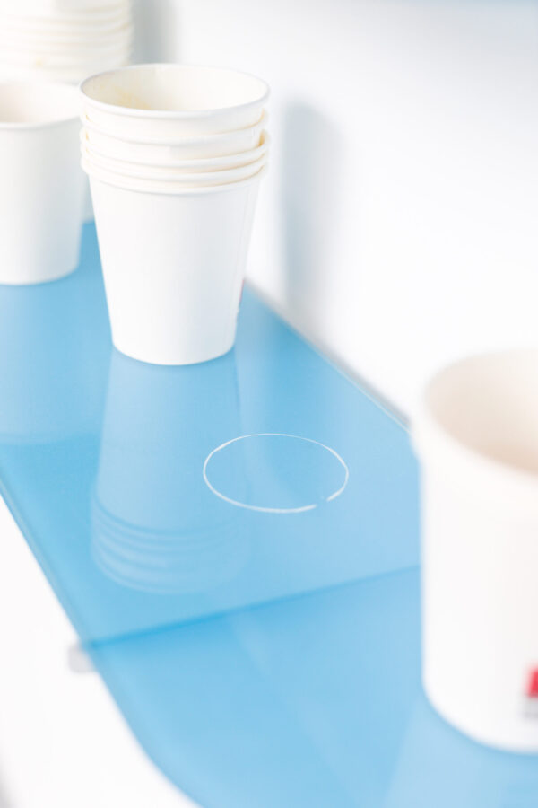 Dans Happy Hours, la nourriture, les boissons et les traces du vernissage font partie intégrante de l’exposition : le public peut se servir directement dans les gobelets présents, déguster le vin ou les chips disposés dans des bols gravés et participer ainsi à cette mise en scène de la fête. Chaque geste et chaque objet deviennent ici un moyen de jouer avec les règles et de repenser nos rituels de départ.