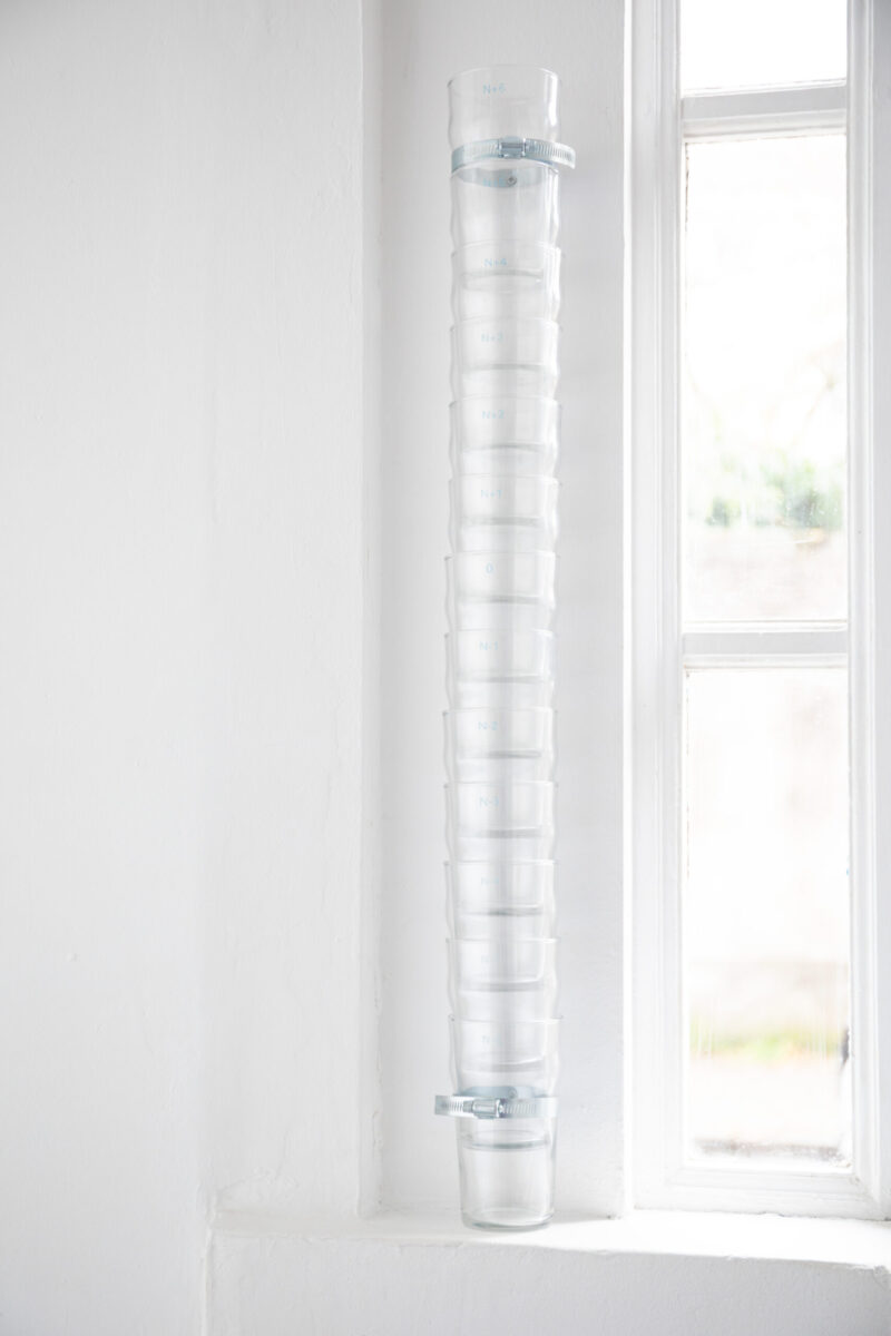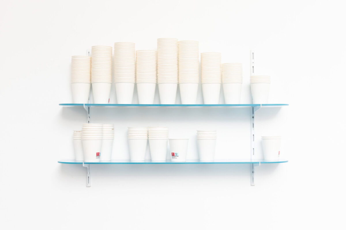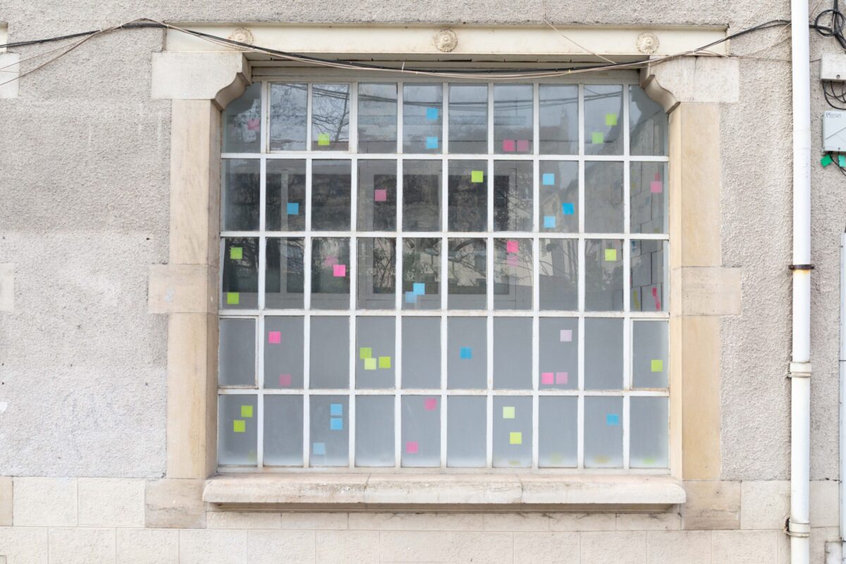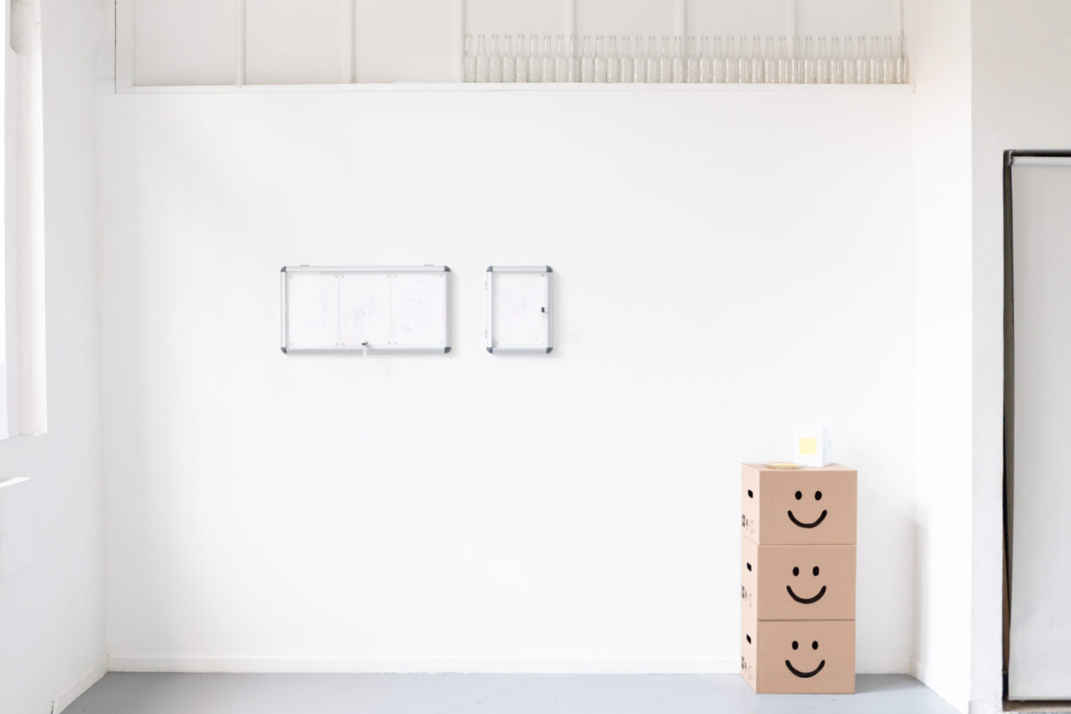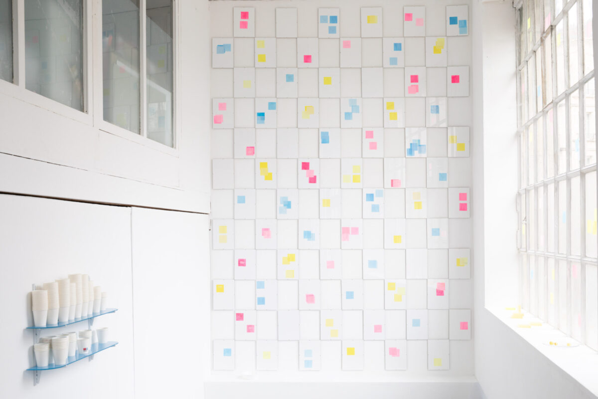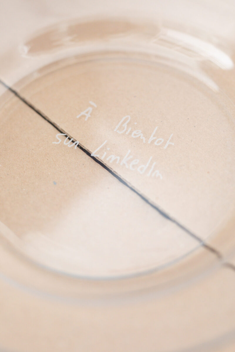 Tout dans l’exposition est précaire, instable, interchangeable. Des dessins au carbone, réalisés d’après des images libres de droit, sont simplement aimantés dans des vitrines d’affichage, prêts à être remplacés. Le verre s’éparpille, évoquant parfois le temps passé, parfois la pression exercée. Un distributeur de gobelets rend visibles les réalités chiffrées du travail. Des cartons, prêts à être évacués, servent encore, le temps d’une soirée, de buffet de fortune. Des modèles de lettres de démission ou de licenciement se déploient au mur. Puis, cadrée dans un accrochage rigoureux, la couleur surgit : des post-it semblant parfois usagés, gravés, deviennent confettis et se répandent jusqu’aux vitres.