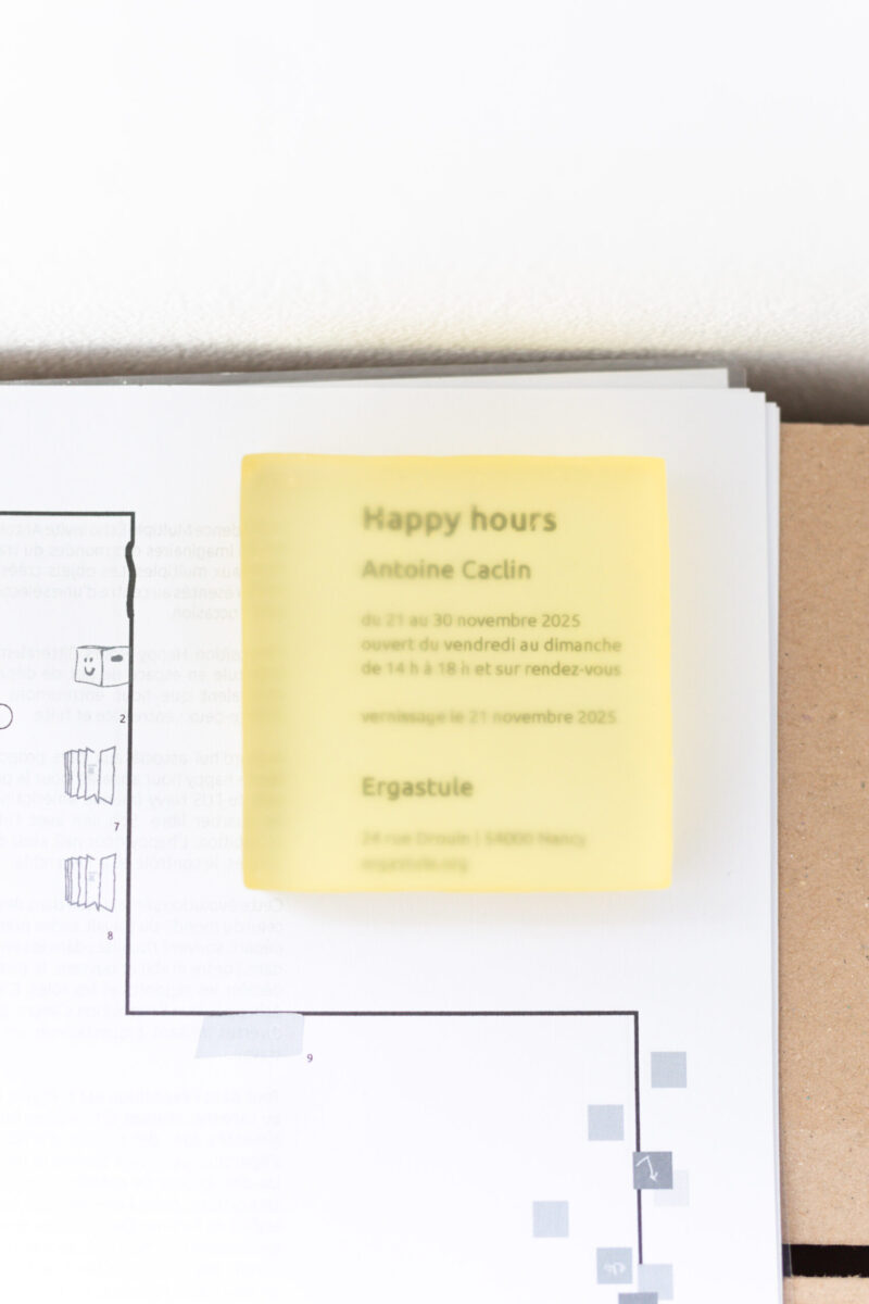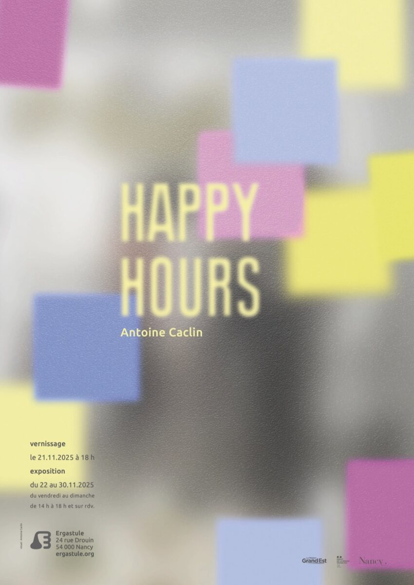 L’exposition Happy Hours (littéralement Heures Heureuses) transforme Ergastule en espace de pot de départ précaire, interrogeant le rapport ambivalent que nous entretenons avec la fin, devenant un moment d’entre-deux : entre fête et fuite.
