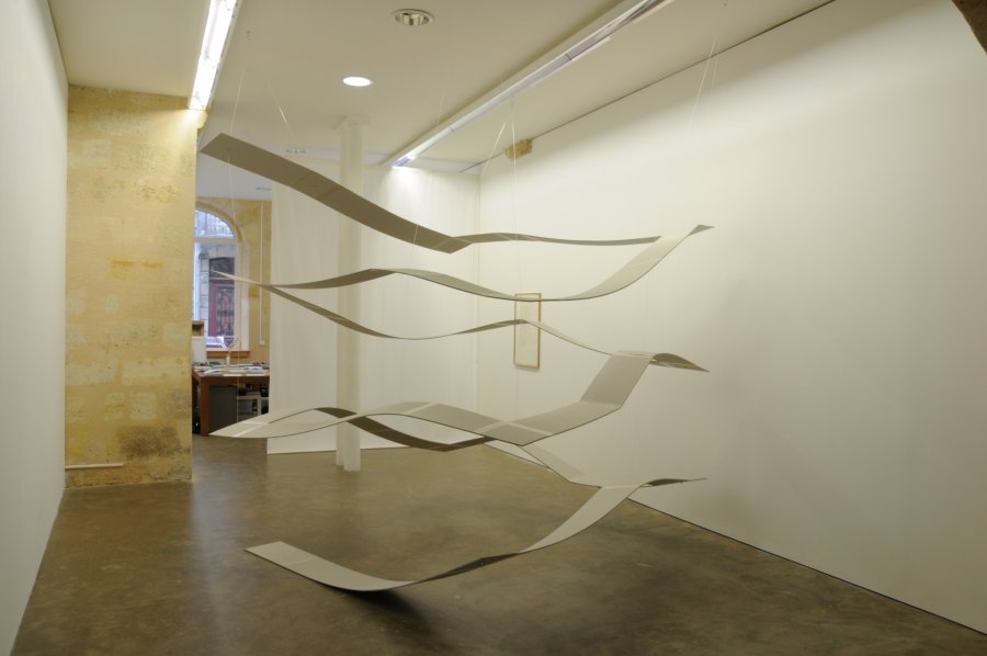 Un volume en carton et scotch, une sculpture en mouvement qui s’autodétruit et une vidéo dans laquelle nos déplacements nous ramènent à la surface d’un paysage. Sculptures et vidéo découpent les espaces et jouent de la limite intérieur-extérieur en multipliant les points de vue. Il y a un déploiement qui retourne invariablement au plat, il y a la fragilité qui nous place dans un perpétuel présent. en attente de l’accident.