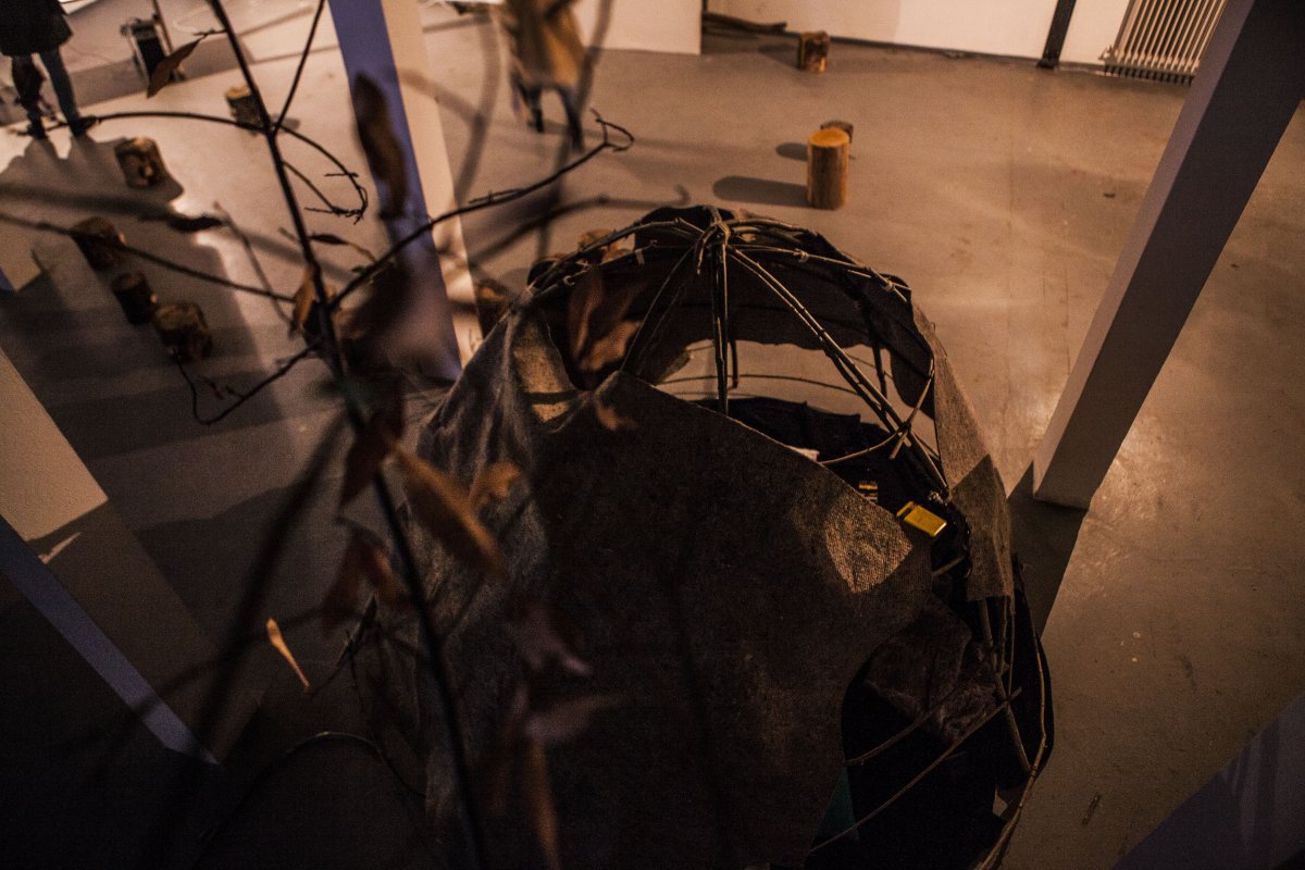 Cette sorte d’abri de fortune, pas complètement achevé, laisse des trouées permettant de voir ou d’être vu par les autres visiteurs de l’exposition. L’atmosphère lumineuse tamisée, les coussins disposés au sol invitent la personne à s’installer pour un certain moment. L’expérience individuelle est au coeur de cette performance.