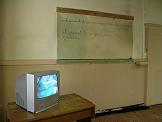 Installation vidéo et sonore dans une ancienne école : textes à la craie sur le mur, vidéos, objets, son.
