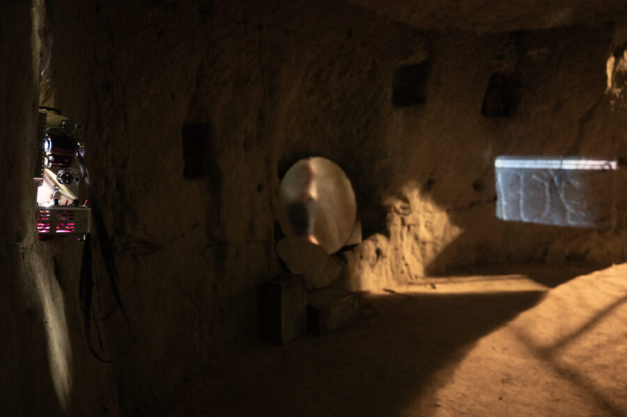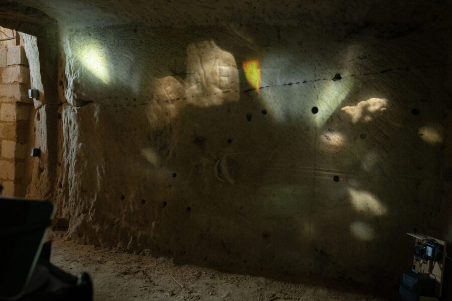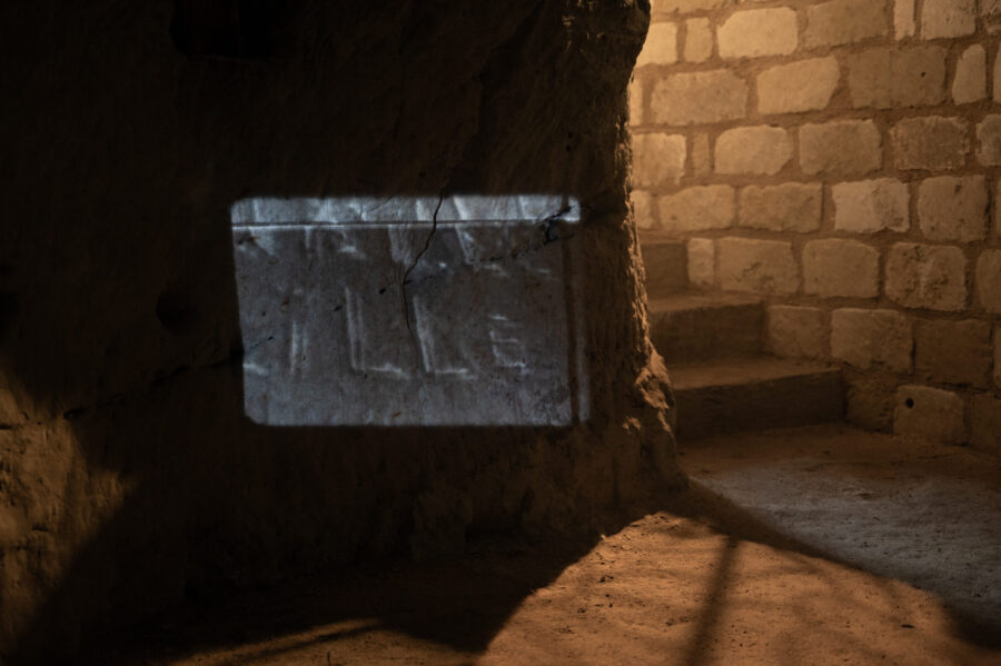 Récoltant sur la pellicule 16mm noir et blanc des syllabes gravées sur les murs des escaliers du Chateau de Montsoreau , développant les images dans une cave troglodyte et glanant des roches calcaires déposées par le Loire sur lesquelles je grave, l’installation est une mise en dialogue d’images fixes et en mouvement, utilisant un projecteur 16mm autonome, une lanterne magique DIY permettant à la fois rétroprojection et projection opascope et un système son spatialisé autonome.