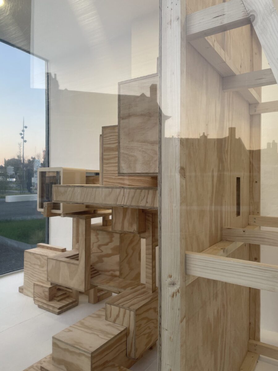 Derrière ses parois vitrées, porte scellée, La borne a des allures de vivarium. Rejouant l’aspect décoratif et souvent théâtral des vitrines commerciales, un panneau se dresse au moyen de trois contreforts. Parasite ou excroissance, une ville miniature s’y développe, module par module, comme un organisme vivant inspiré des mousses, champignons et autres rhizomes qu’on aurait laissé proliférer dans un milieu hermétique favorable. Dans cet entremêlement de blocs, un d’entre eux se détache légèrement : il s’agit d’une reproduction de La borne. Elle est maintenue en lévitation par un réseau architectural qui la traverse à moins qu’elle n’en soit à l’origine.