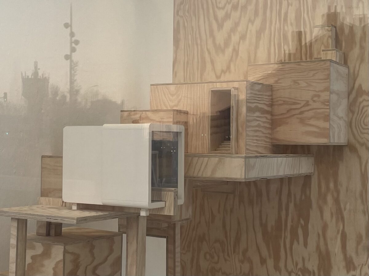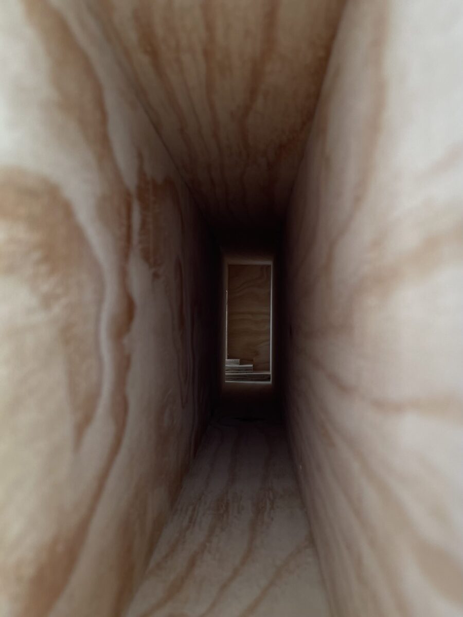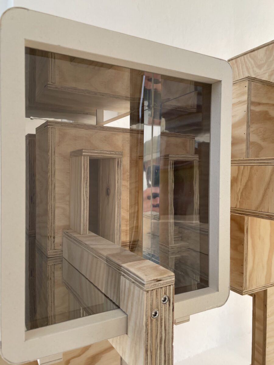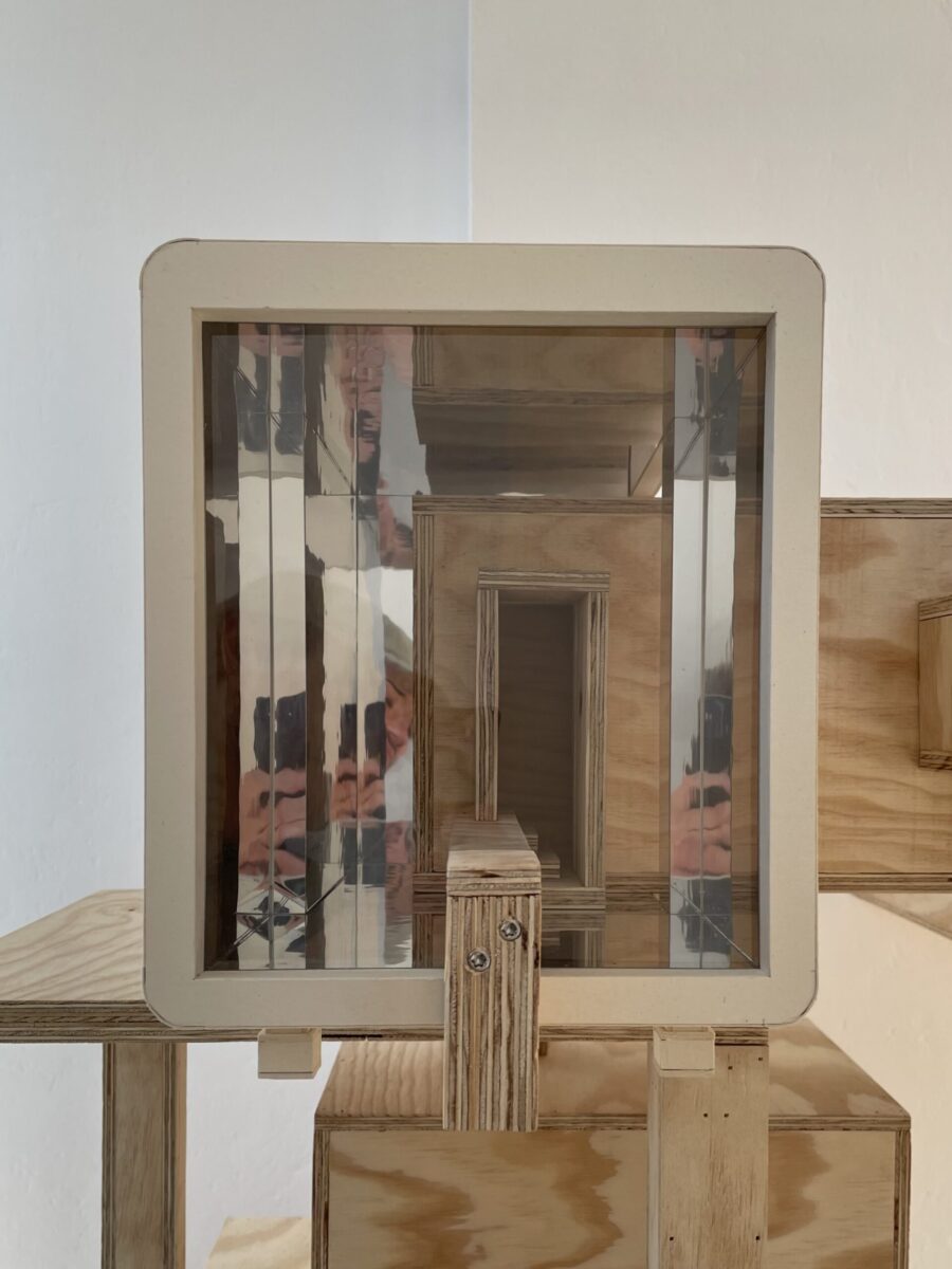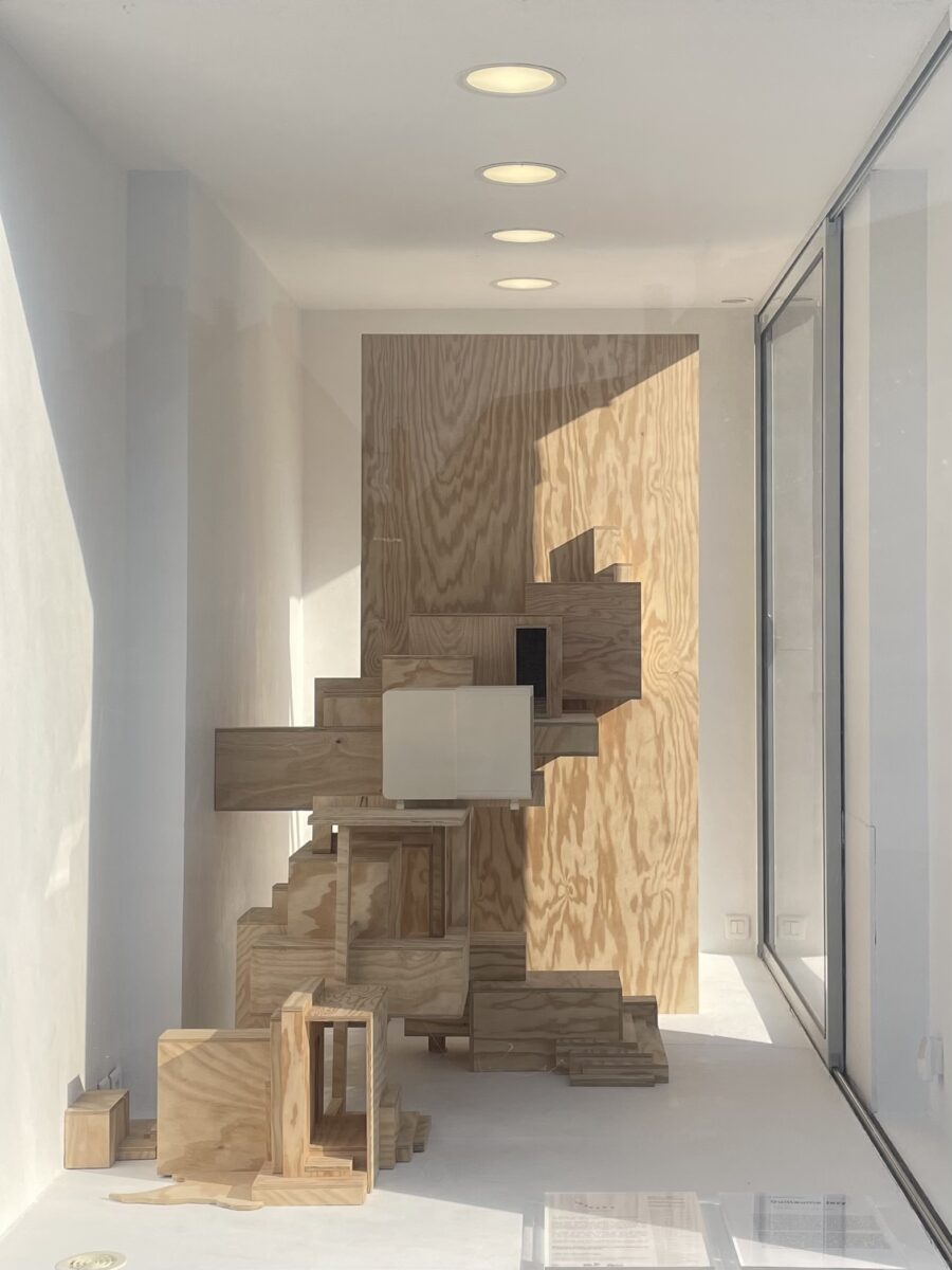 Guillaume Jezy, «In vitro (la borne)», 2026, bois, carton, plexiglas, La borne (POCTB), Mehun-sur-Yèvre, photographie : Sébastien Pons - POCTB