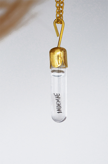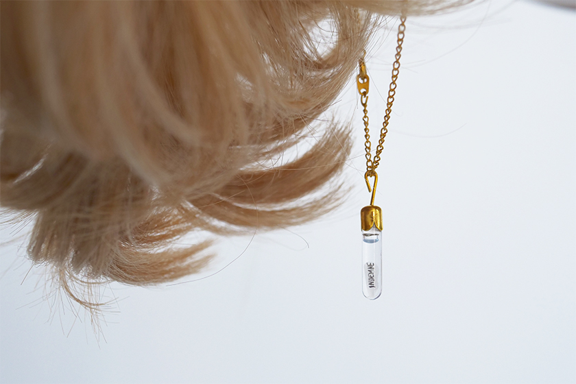 perruque semi-naturelle, collier grain de riz, plastique, métal, 2021