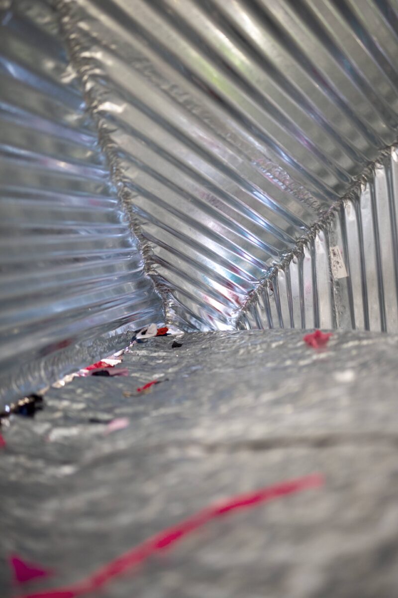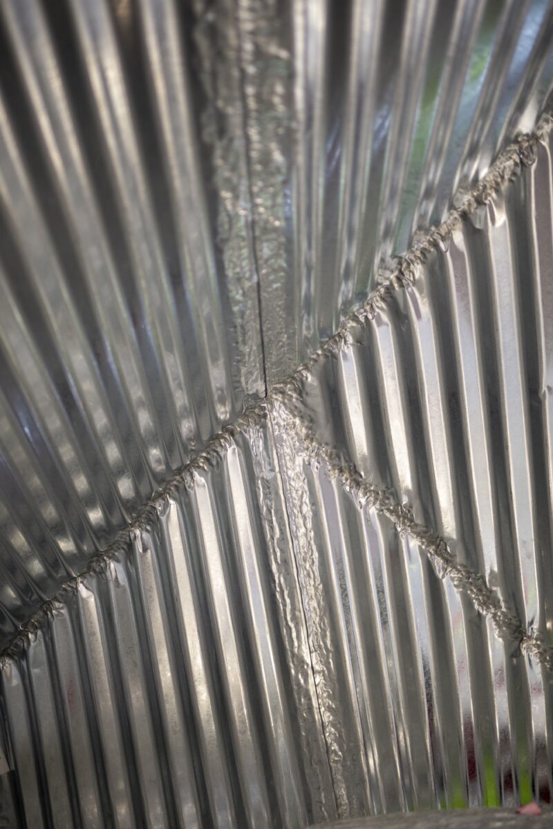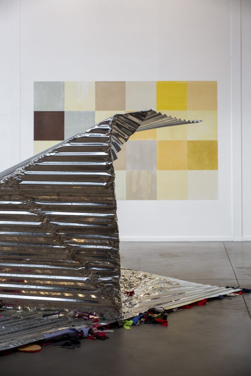 6 plaques de toles ondulées, jointées par plis et martelées, acier galvanisé, rebus de textiles, 260 x 300 x 155 cm
