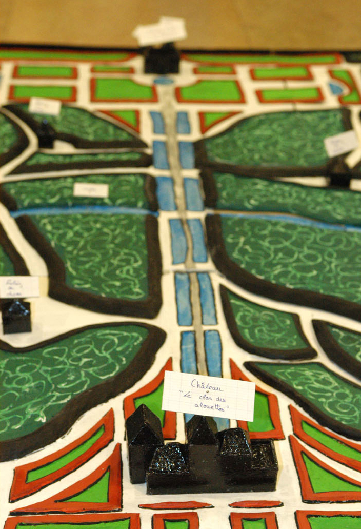 Dans la continuité des maquettes de châteaux inspirées de dessins d’enfance, réalisées avec une maladresse et une naïveté volontaire, j’ai construit en carton un jardin d’un mètre sur un mètre cinquante environ. Ce jardin, composé de plusieurs morceaux que l’on assemble a même le sol comme un puzzle géant, est la mise en relief d’une cartographie imaginaire dessinée à l’âge de douze ans. Ce parc servait d’écrin à un château fictif, le « Clos des Alouettes ». J’en dessinais sur des cahiers d’écolier les décors intérieurs et extérieurs qui servaient de cadre à des scènes de vie que je mettais en bandes dessinées.