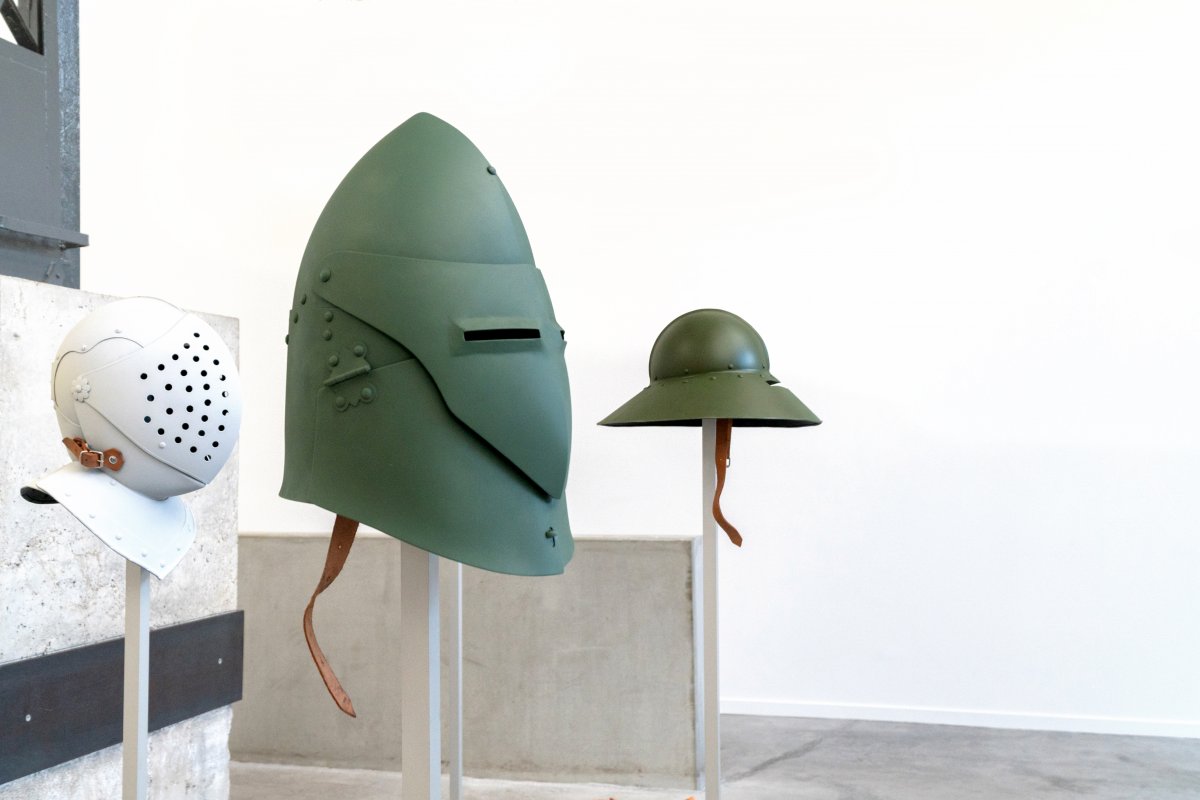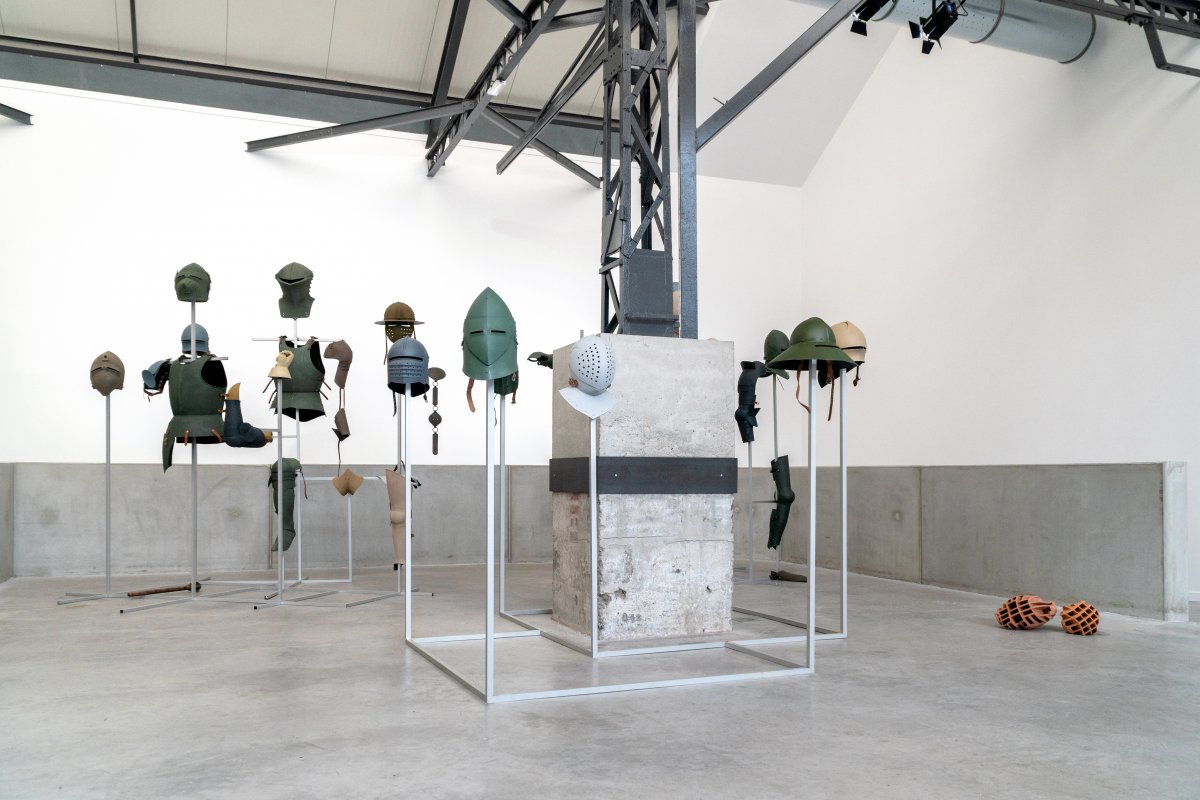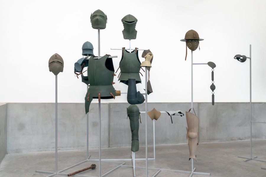 Des éléments issus de plusieurs installations composées d’armures médiévales créent un environnement étrange peuplé de cuirasses aux tons terreux ou verdâtres. Ainsi peints, les plastrons, casques et boucliers ressemblent à s’y méprendre aux équipements des actuelles forces de l’ordre ou des armées des films de science-fiction.