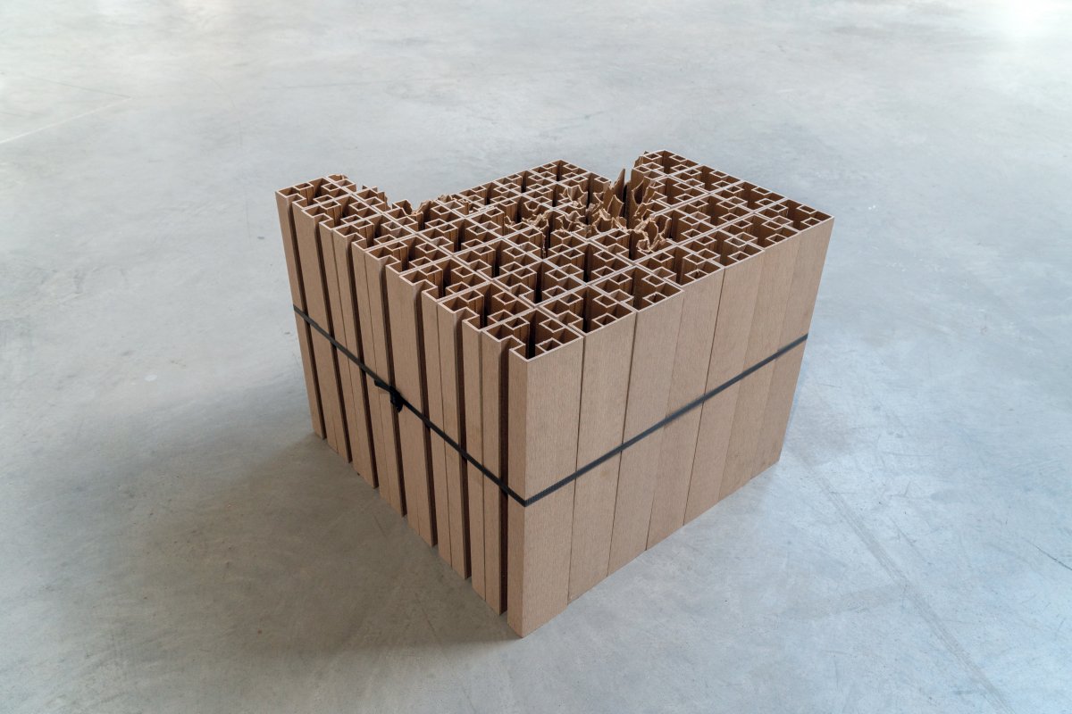 Au centre d’art Le Garage, Vincent Mauger articule plusieurs créations récentes ou inédites. Çà et là, au sol, des reliefs rappellent de loin des décombres. En progressant, on discerne davantage ce qui pourrait ressembler à des munitions, d’étranges projectiles. Cependant, nul engin destiné à les propulser à proximité… L’artillerie défensive se révèle totalement dérisoire. Paradoxalement, chaque volume a visiblement été façonné à partir de matériaux de construction relativement élaborés. On reconnaît ici des briques alvéolées, là des parpaings, sculptés un à un, pièce par pièce.