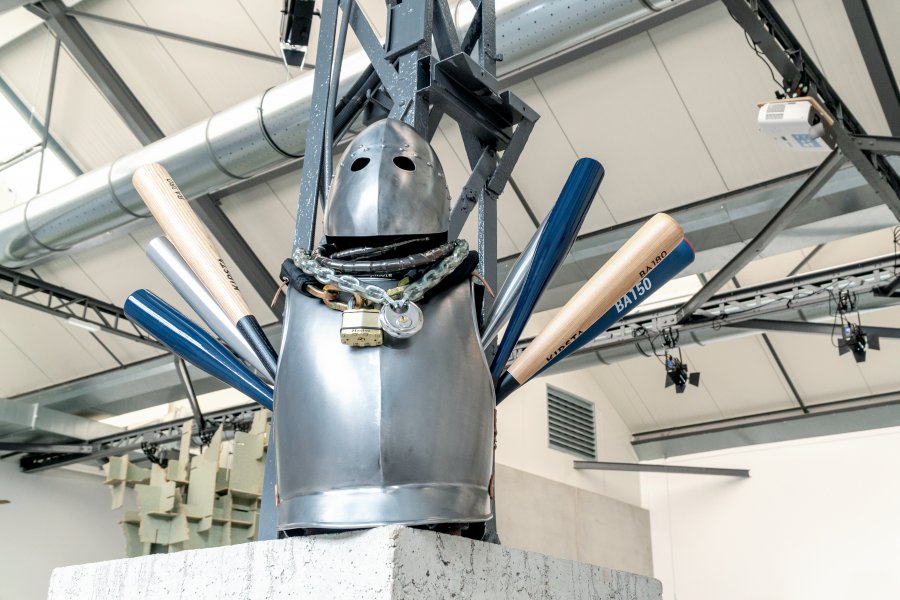 Des éléments issus de plusieurs installations composées d’armures médiévales créent un environnement étrange peuplé de cuirasses aux tons terreux ou verdâtres. Ainsi peints, les plastrons, casques et boucliers ressemblent à s’y méprendre aux équipements des actuelles forces de l’ordre ou des armées des films de science-fiction.
