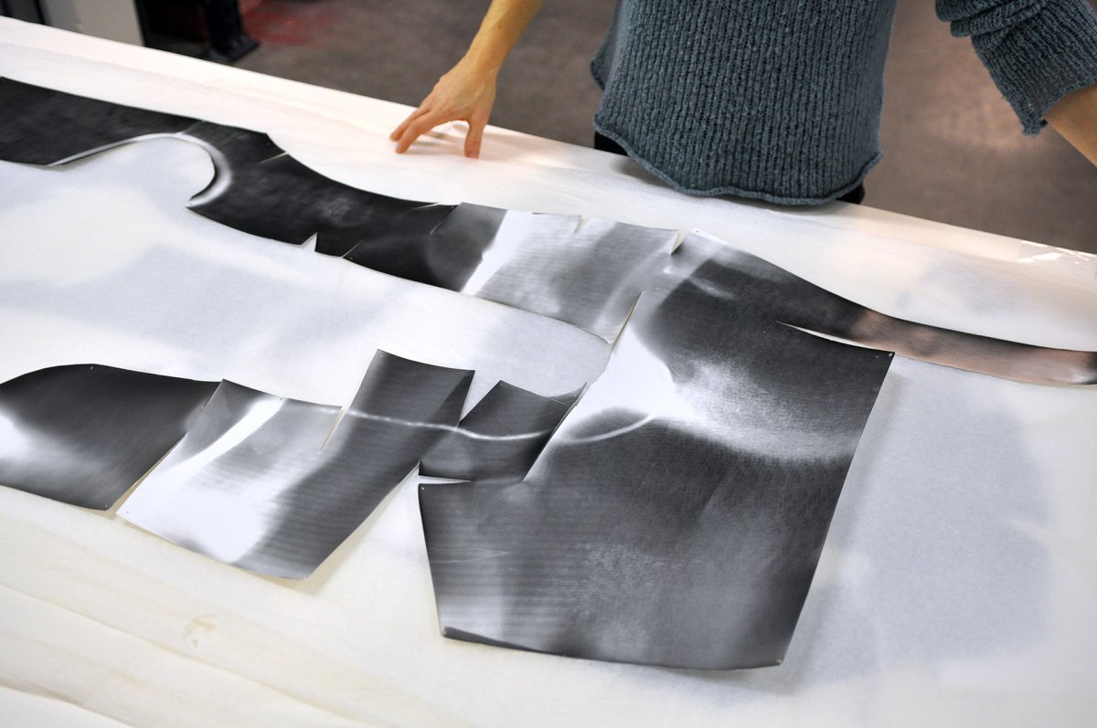 Pour rester dans le domaine des possibles, sans en fixer vraiment les frontières, Laurent Moriceau décide plus tard de limiter son rapport au photographique à l’emploi détourné du papier sensible. Tout d’abord dans k-shirt, il découpe du papier photographique aux formes d’un modèle et le place, à même la peau, sous le vêtement. La lumière du jour filtrant à travers le tissu, la chaleur du corps, impressionnent le papier qui garde, une fois fixé, une trace, une « image » symbolique du modèle et, toutes proportions gardées, a valeur de relique à l’instar du Saint Suaire. Nous sommes déjà, comme ensuite avec Eva, Eva, dans la continuité de la tradition classique de la relation privilégiée entre l’artiste et son modèle.
