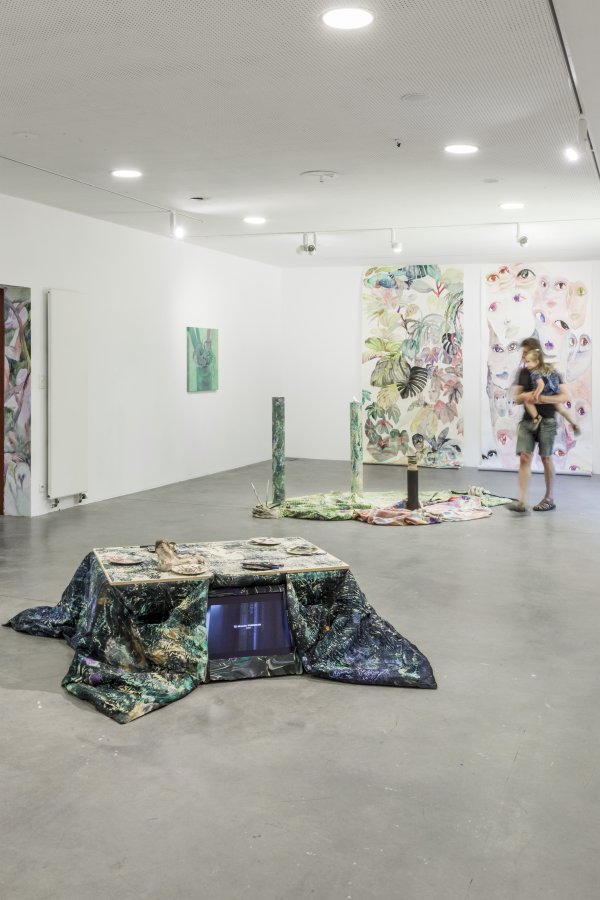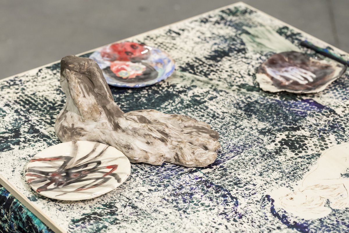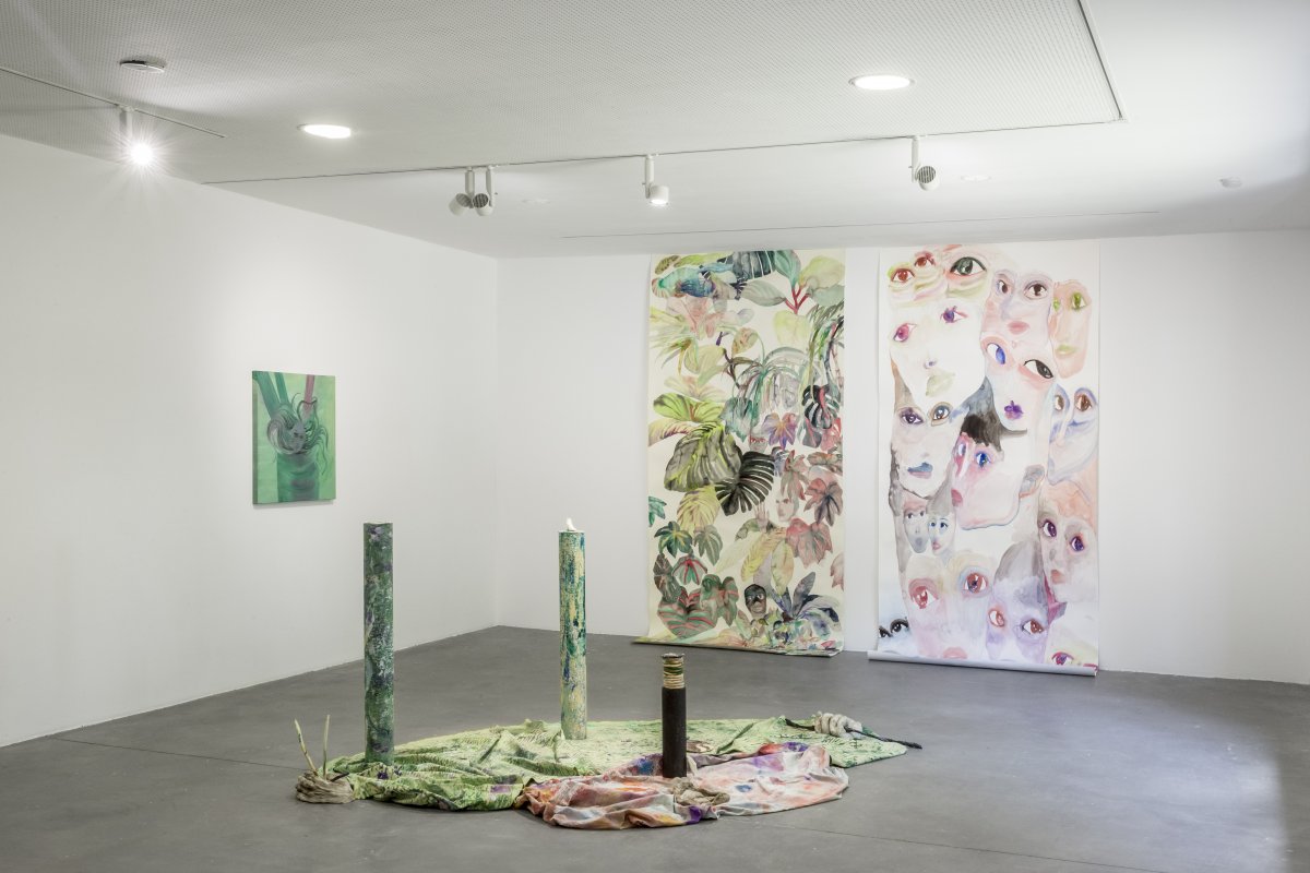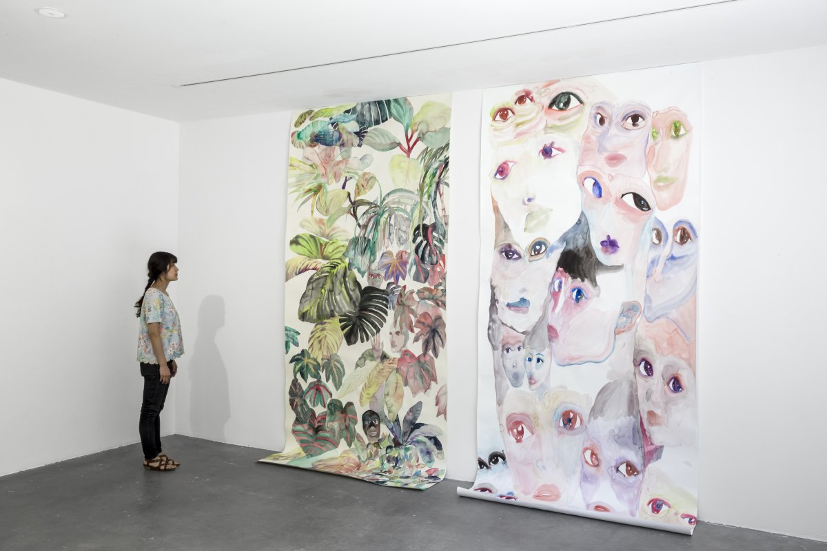 Makiko Furuichi, «KAKI Kukeko», 2018, aquarelle sur papier, céramique, pyrogravure, peinture à l’huile, aquarelle sur mur, etc, Frac des Pays de la Loire, Carquefou