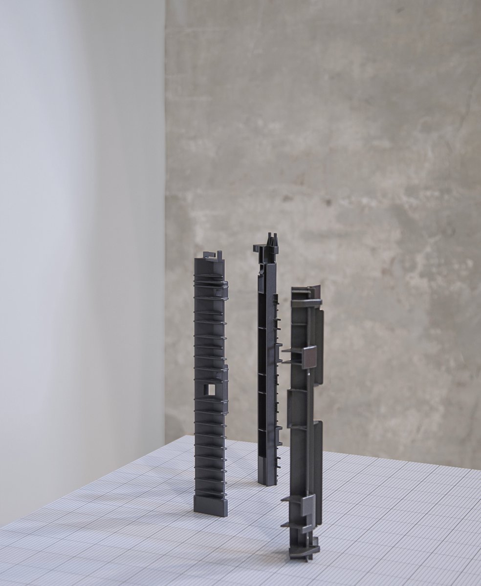 Pierre Besson, «Sinep», 2019:2021, 3 sculptures, résine, 37 x 4,8 x 4 cm, 34 x 7,5 x 5,5 cm et 38 x 5,3 x 2,5 cm, fixées sur grille imprimée sur dibond: 140 x 80 cm.
