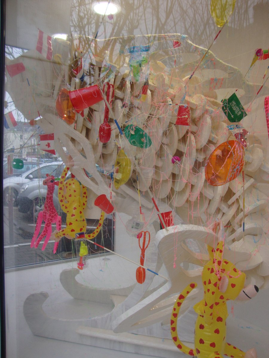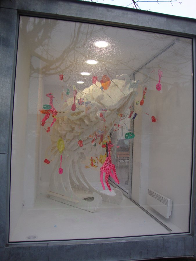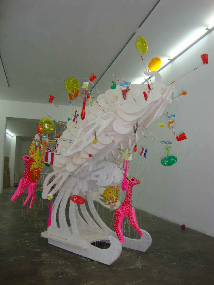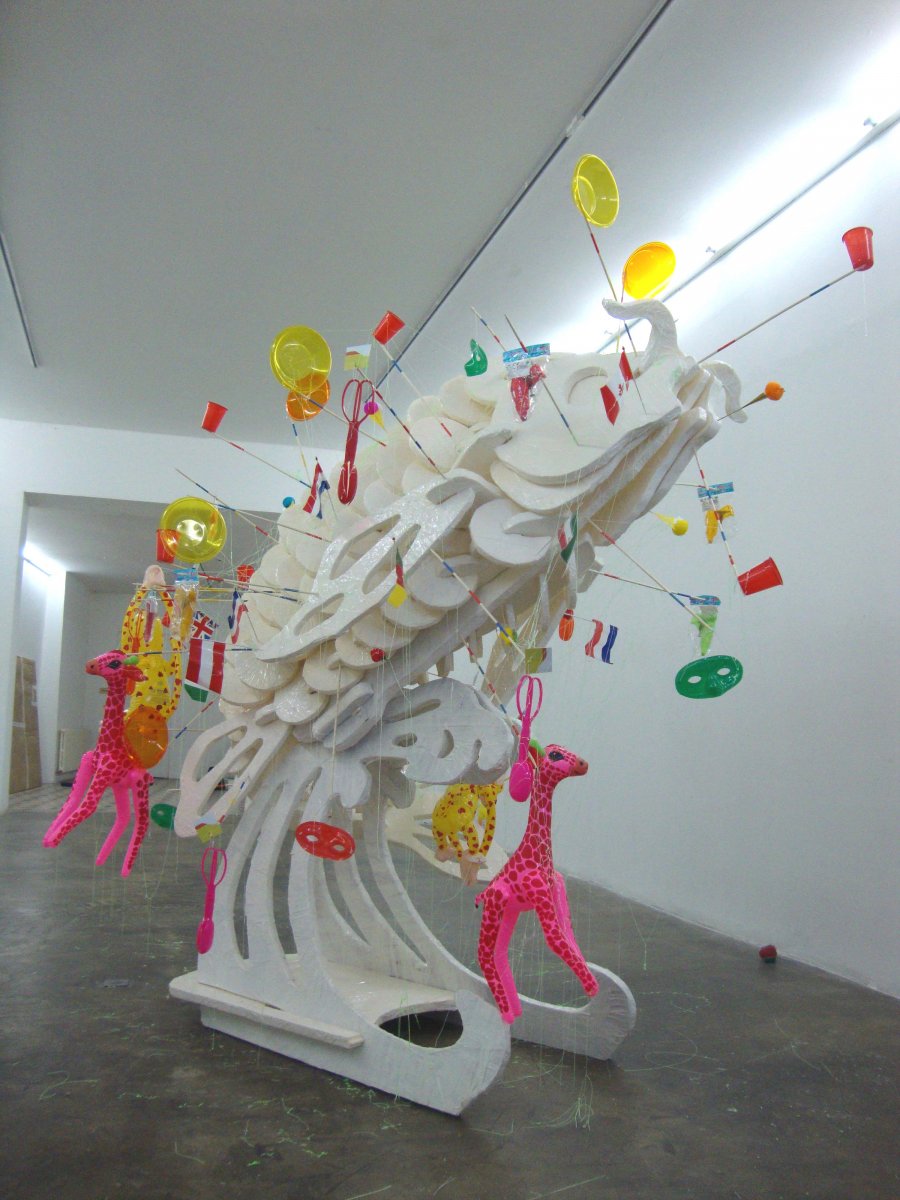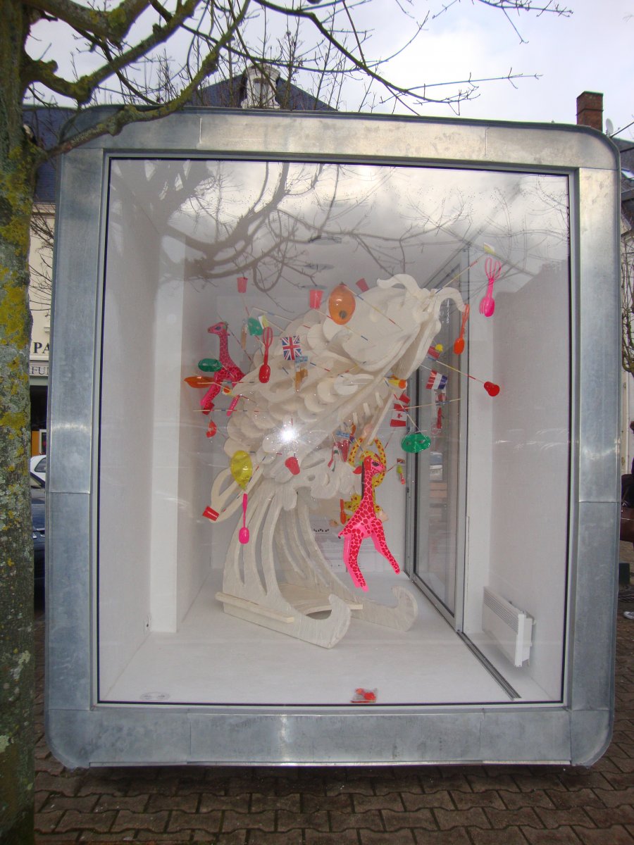 Une chinoiserie est un objet d’art dont l’esthétisme procède du courant orientaliste. Cette installation est réalisée à partir d’une petite maquette pour enfant ac…hetée dans un magasin made in China. Par le changement d’échelle qui l’inscrit à la manière d’un décor de spectacle, cette sculpture est à la fois grandiloquente mais aussi fragile dans sa composition. La borne devient ainsi un aquarium réceptacle d’un étrange poisson, affublé d’objets colorés. Il reflète un goût pour un Orient rêvé mais aussi paradoxalement une critique de notre monde de consommation. Les premiers signes de cette forme d’art apparaissent au début du XVIIe siècle, dans le contexte artistique de pays tels que la Hollande et l’Angleterre, dont le commerce avec l’Orient est très développé. Le développement du commerce avec la chine aujourd’hui et c’est un euphémisme, m’amène à revisiter à ma manière ce courant artistique