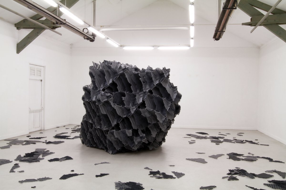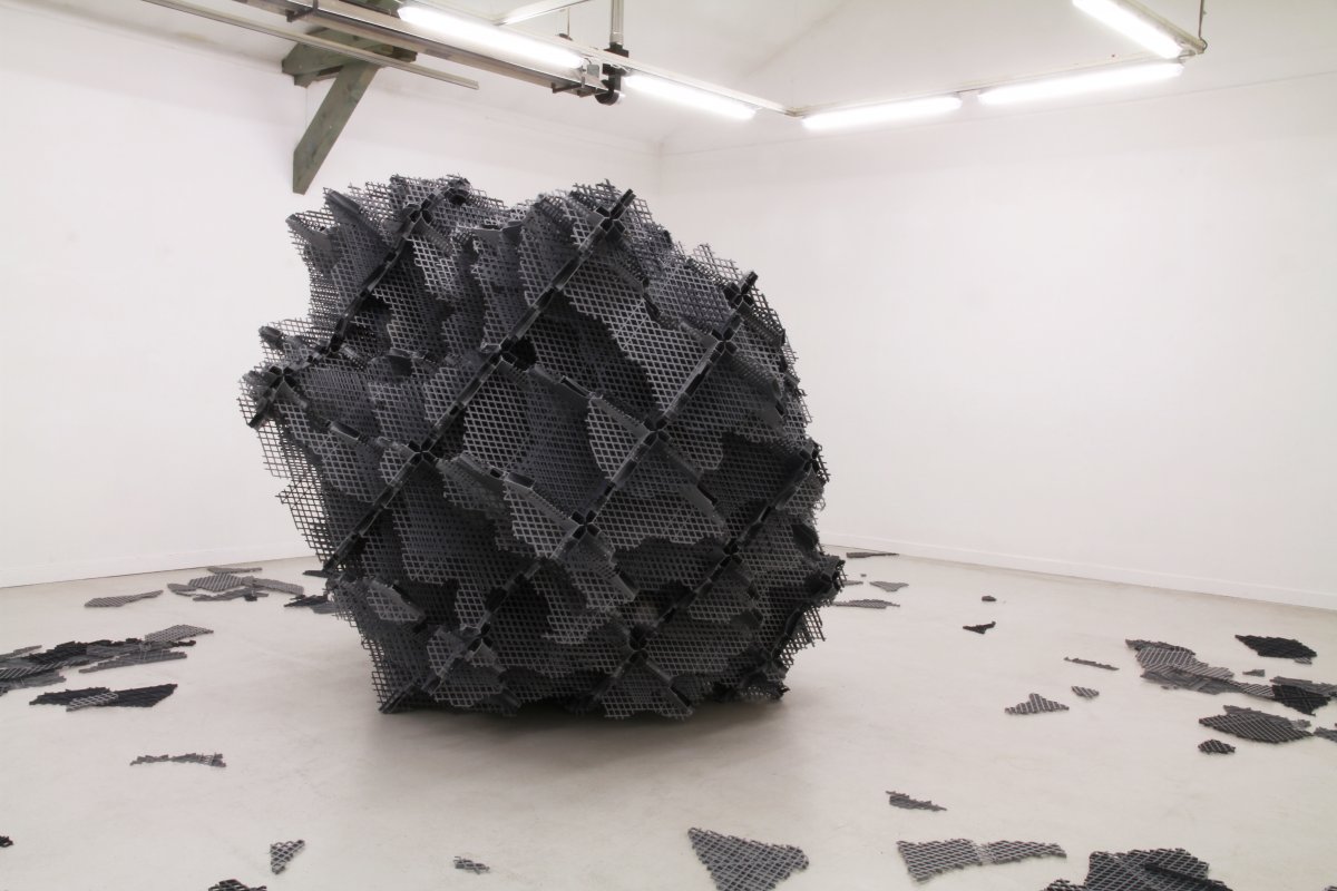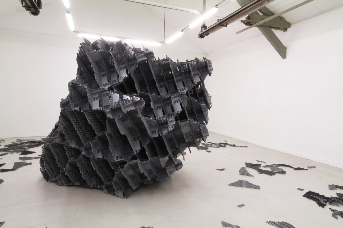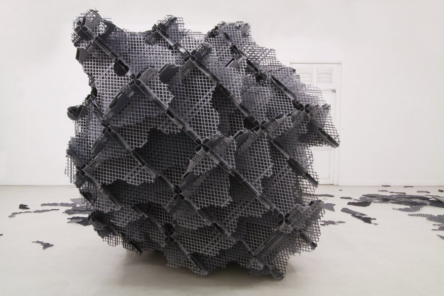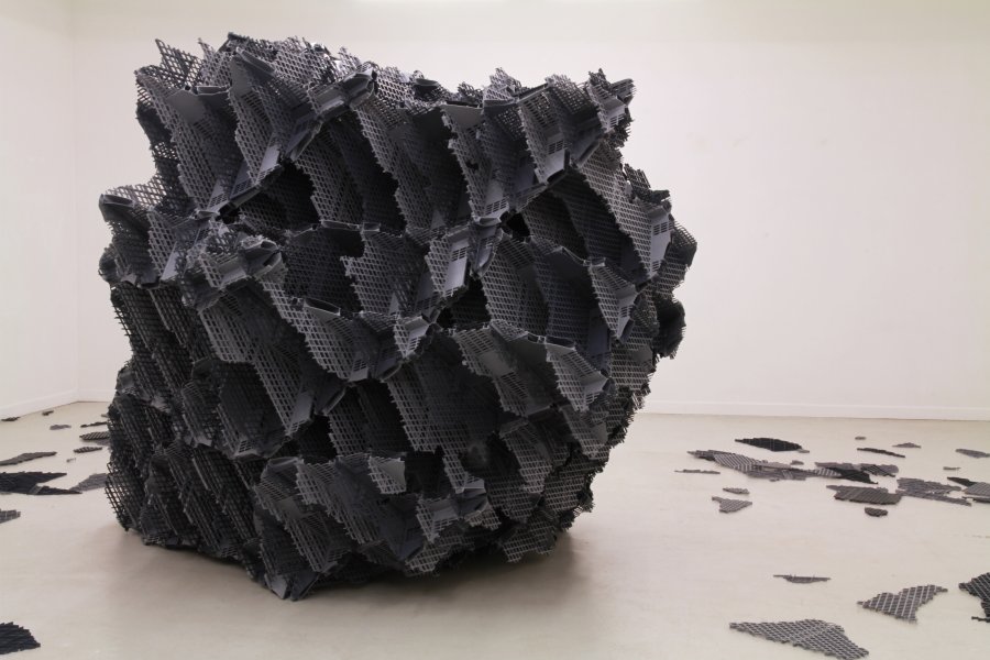 V.M. : Je ne considère pas que j’efface les coutures. Je choisis souvent un mode d’assemblage régulier et répétitif qui reste visible. La répétition des éléments de fixation les fait participer à la trame constituant le volume et leur confère cet aspect discret contrairement par exemple à un collage visible pouvant laisser des coulures irrégulières. Un assemblage par vissage ou boulonnage induit également une lecture différente de la proposition par rapport à un collage qui fixe les objets d’une façon définitive et irréversible. Cette façon d’assembler laisse l’idée de modification possible de l’objet. Il s’agit d’une proposition de composition réalisée à partir d’un système de construction mais la liberté d’imaginer une évolution est laissée au spectateur. L’objet n’est pas figé. Il est l’illustration d’un principe. Mon travail peut par de nombreux aspects se rapprocher de l’œuvre de Richard Deacon, mais la logique de construction des sculptures est différente. R Deacon met en avant les singularités dues aux assemblages ; il peut déformer le matériau en employant des techniques artisanales ; il met en avant les irrégularités des différentes matières employées. Mon travail tend par contre souvent à la répétition d’opérations et d’éléments simples visant à créer une trame interne régulière et visible au sein des sculptures ou des installations. Au moment de la réalisation, toutes les questions de constructions ont été évacuées. Il s’agit dès lors d’explorer les potentialités du système mis en place. En cela mon travail peut également par certains aspects se rapprocher d’un travail minimaliste par l’utilisation d’un système et de la répétition. Cette façon de construire un volume met en avant l’analogie qui peut exister entre un système de construction concret et un système de conceptualisation du réel sous une forme schématique. L’aspect interne des sculptures obtenues découlent de cette logique : leurs organisations fait écho aux univers scientifiques, mathématiques, virtuels. La forme extérieure des sculptures peut indistinctement évoquer des formes organiques, minérales ou biologiques suivant les propositions que je réalise et la personne qui les regarde. Ce sont des formes abstraites, finalement assez proche des tests de Rorchach.