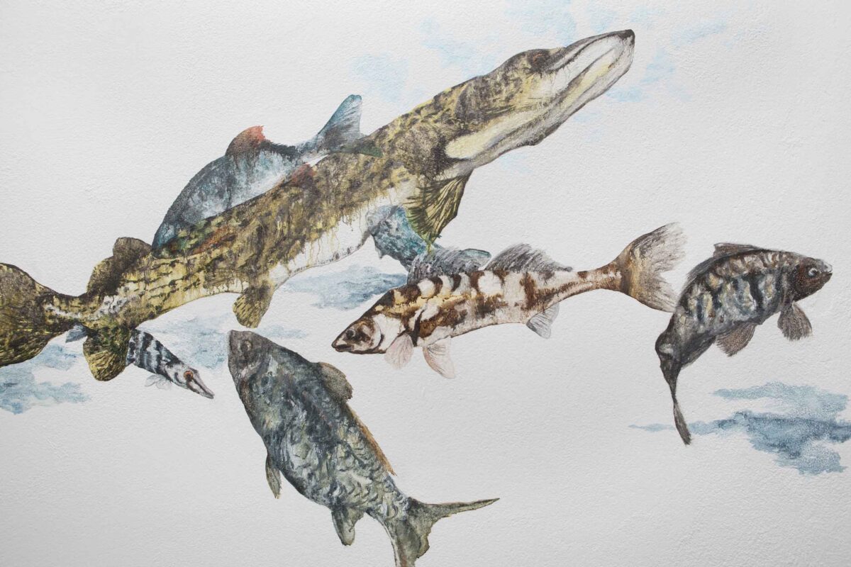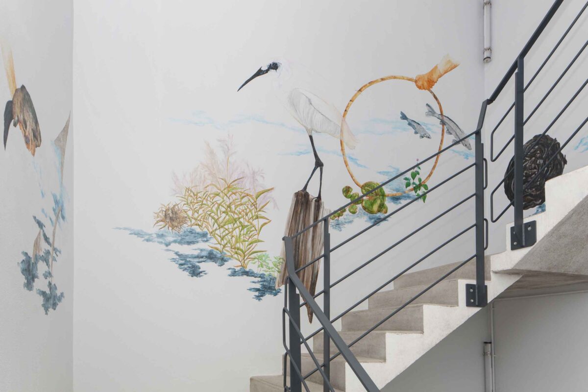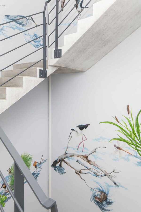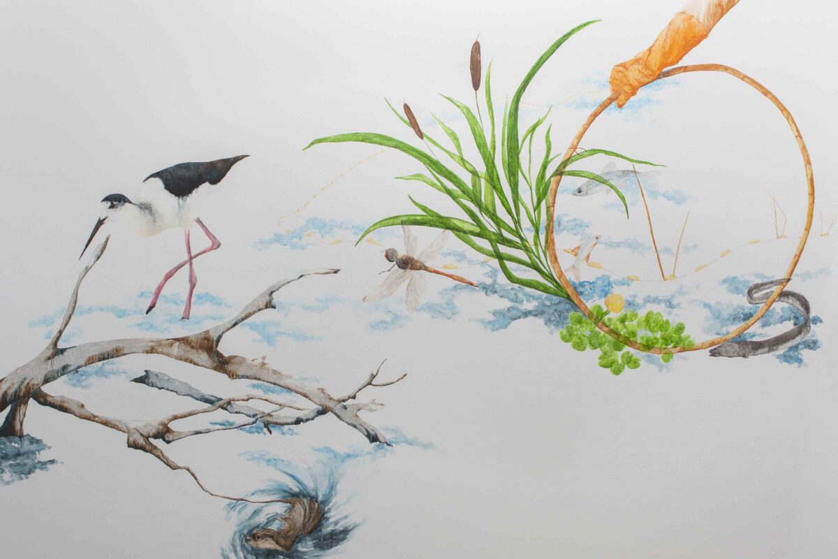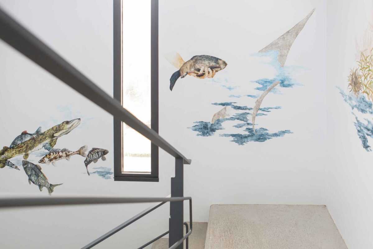 Mon intention était de réaliser une bande de paysage horizontal courant le long des murs et d’étage en étage. Cette bande est composée de fragments de paysages : motifs végétaux (herbiers flottants, roselières boisées…), animaux (oiseaux, amphibiens, insectes, petits mammifères, etc…), des mains de pêcheurs (le travail est évoqué par les mains, celles qui saisissent les filets, les réparent, les démêlent.. Les mains qui rament, posent les bosselles et les verveux dans l’eau…). Cette bande déroulée de paysage est à la fois un écho aux fragments aperçus au-dehors au sol et des étendues vues d’en haut, mais aussi au graphisme des verveux, exposés dans le musée.
