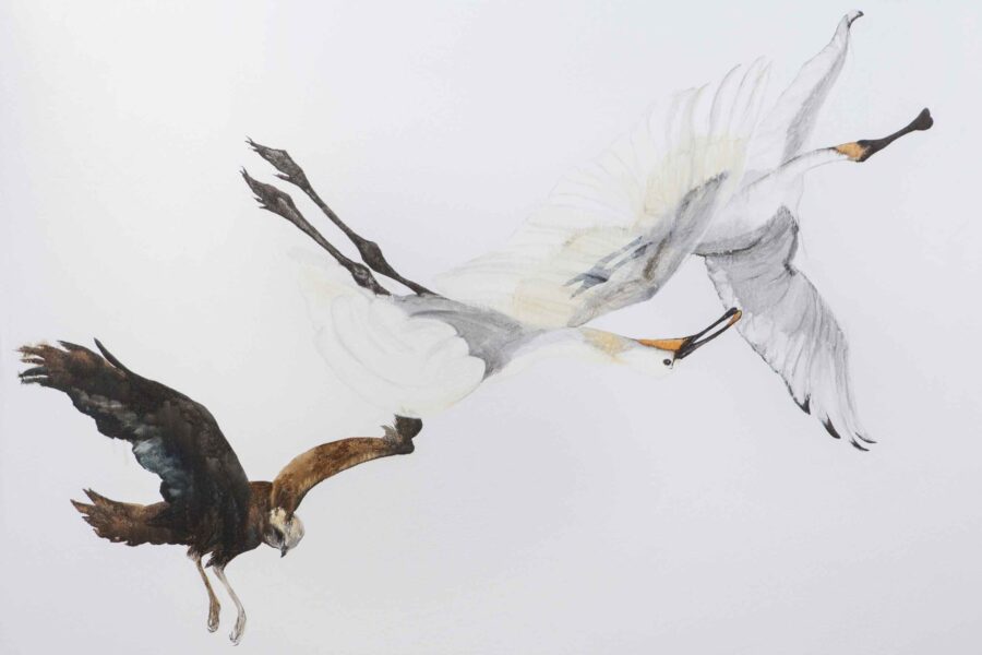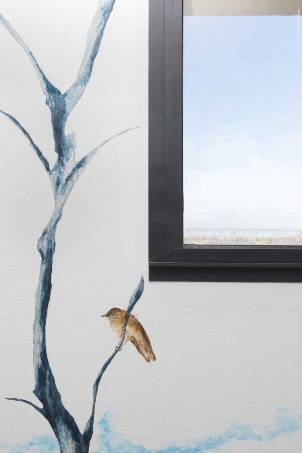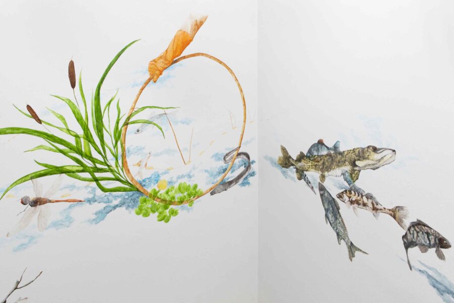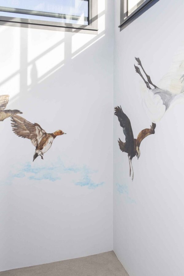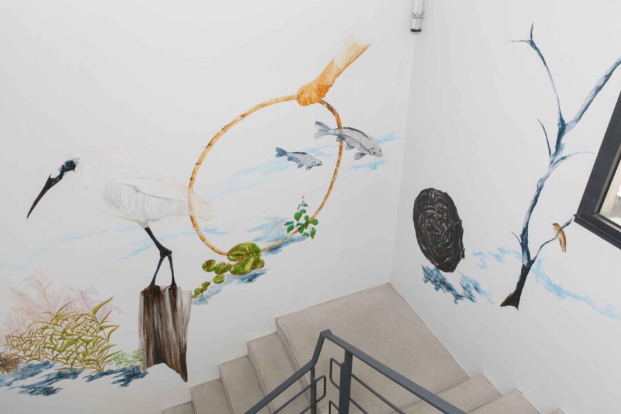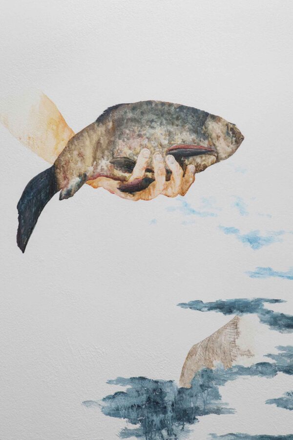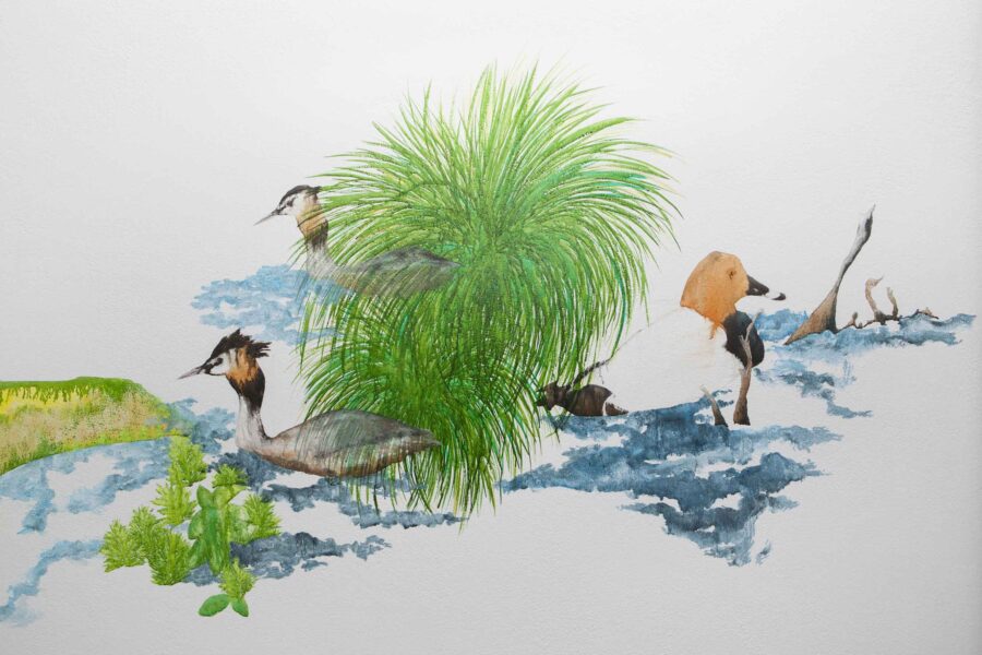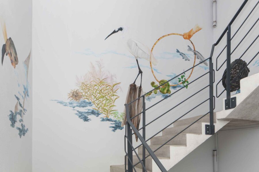 Mon intention était de réaliser une bande de paysage horizontal courant le long des murs et d’étage en étage. Cette bande est composée de fragments de paysages : motifs végétaux (herbiers flottants, roselières boisées…), animaux (oiseaux, amphibiens, insectes, petits mammifères, etc…), des mains de pêcheurs (le travail est évoqué par les mains, celles qui saisissent les filets, les réparent, les démêlent.. Les mains qui rament, posent les bosselles et les verveux dans l’eau…). Cette bande déroulée de paysage est à la fois un écho aux fragments aperçus au-dehors au sol et des étendues vues d’en haut, mais aussi au graphisme des verveux, exposés dans le musée.