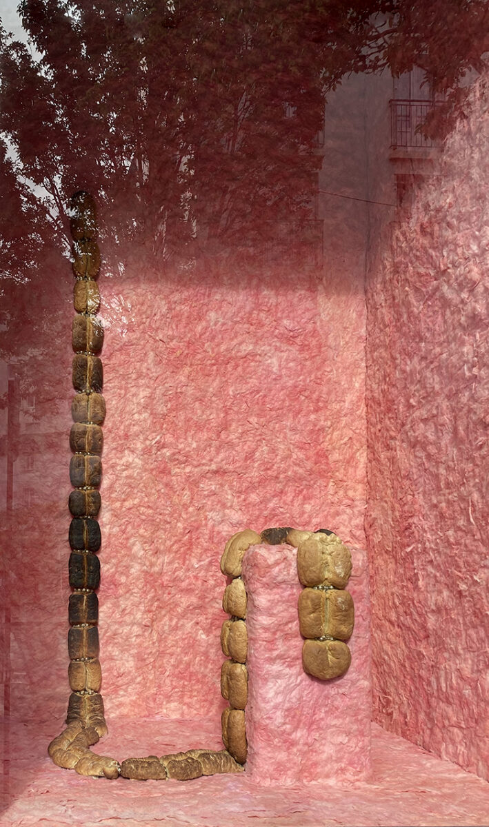 Un long pâton est comprimé par des colliers de fixation en acier double. Passé au four, le pain gonfle sous la contrainte des corps étrangers. Vue de l’exposition vitrine Outdoor is Indoor, Zoo galerie, Nantes