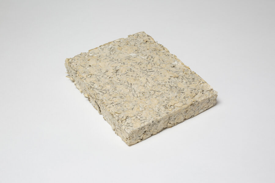 J’ai mélangé ces pages râpées avec de l’eau pour en faire de la bouillie, puis je l’ai compressée dans un coffrage qui reprend les dimensions exactes du livre original pour en refabriquer un nouveau — un bloc de mots devenus illisibles.