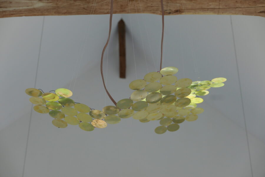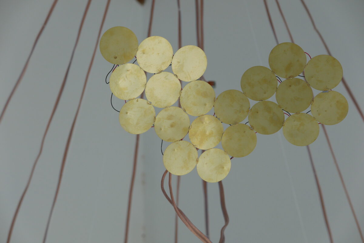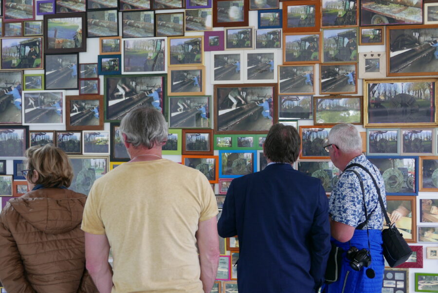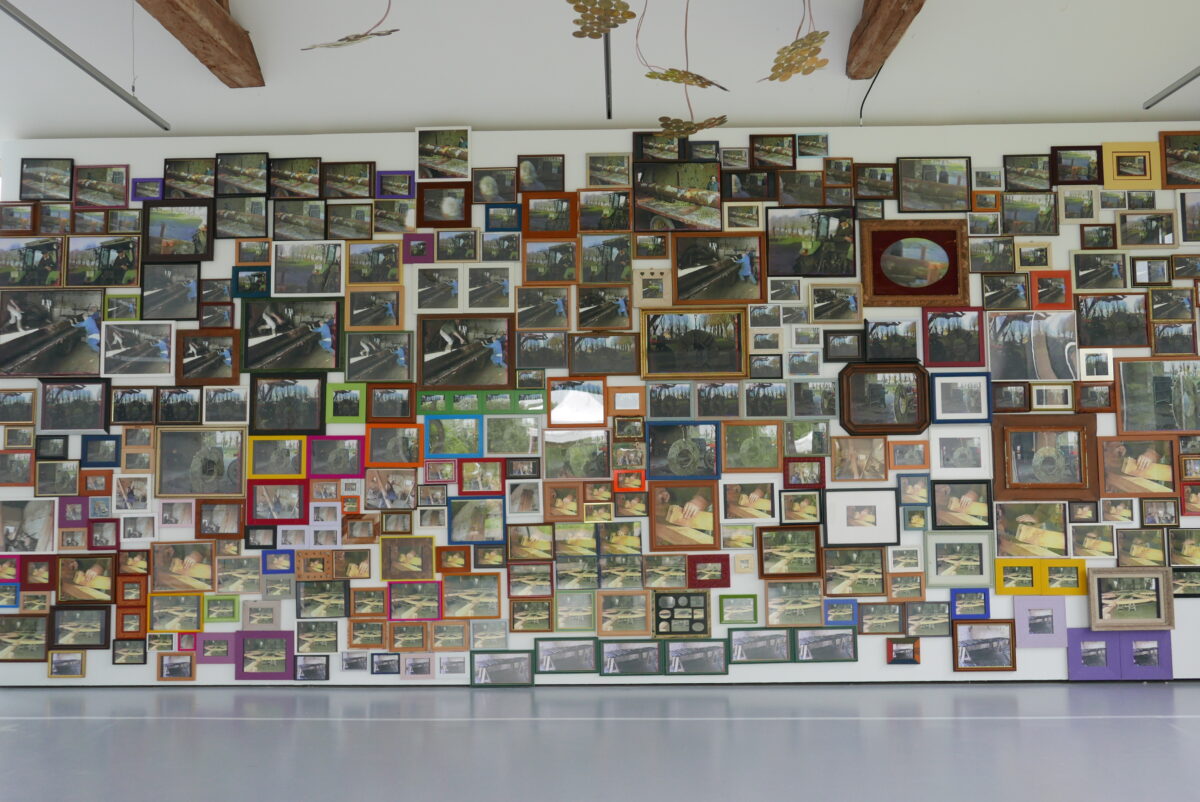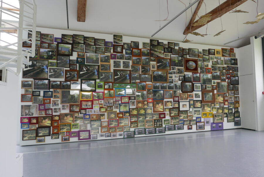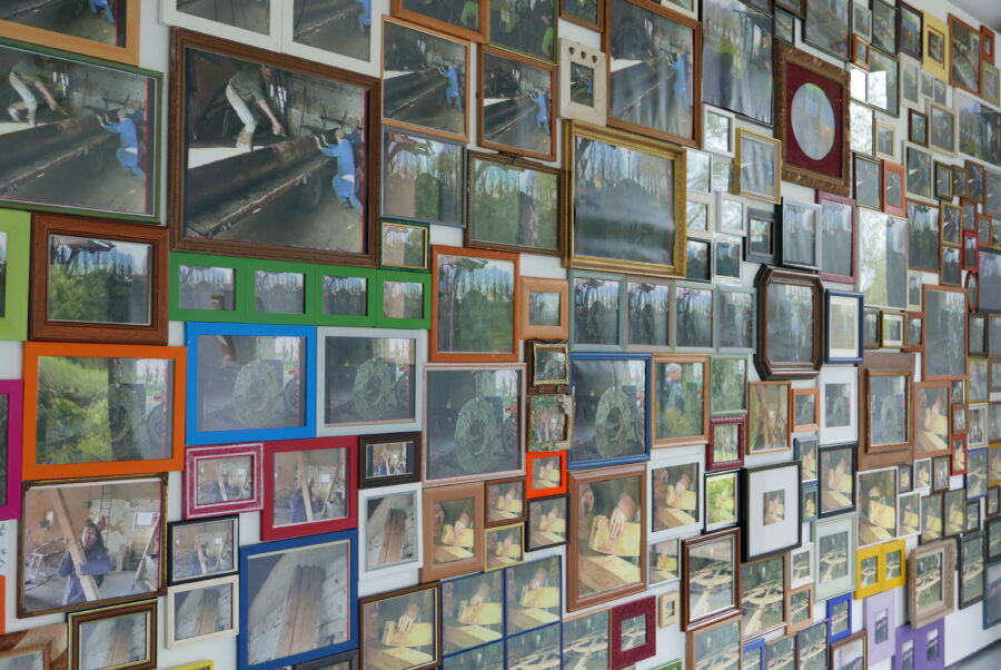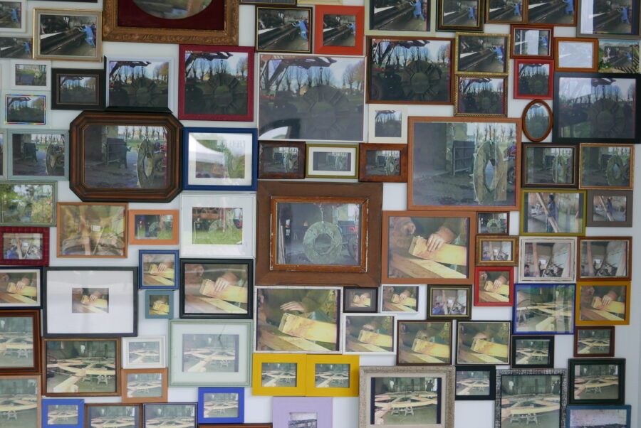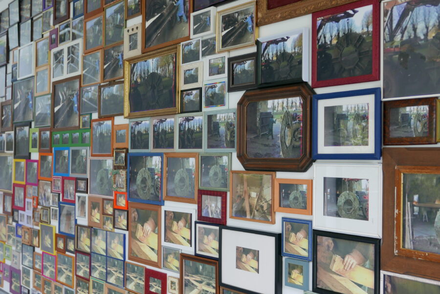 L’oeuvre de Blandine Brière est le fruit d’un travail de collecte de témoignages sonores auprès des figures locales ayant participé à la réhabilitation du lieu ; des histoires singulières qui habillent la roue du moulin aux origines archaïque. De ces recherches une histoire l’interesse particulièrement, MoulinsArt fut le lieu de la restauration du moulin Cyprien. Suite à la fin de l’activité du moulin Cyprien en 1975, un chantier citoyen pris place dans cet espace d’exposition, qui était au départ des écuries, pour la restauration de la roue en 1995, une origine qui n’est pas anodine pour un centre d’art. Deux installations se faisant écho sont nées de cette histoire, l’une photographique 333 photos encadrées, des images d’archive filmées au caméscope, lors de cette restauration, refont mur. L’autre sonore, 400 piezos (microphone de contact, souvent placé dans la caisse d’un instrument) sont ici transformés en haut-parleur en contact avec l’air du centre d’art diffuse les vibrations du moulin.