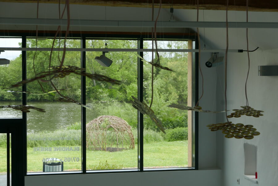 La dormeuse éveillée, a été imaginée dans le cadre d’une résidence de recherche sur le site de l’île MoulinSart, en regard du Moulin Cyprien datant du XVe siècle. Symbole de l’espace et du temps, la roue du Moulin est aussi la manifestation des forces en mouvement. C’est l’expression de l’énergie centrifuge, qui va du centre vers la périphérie, et de l’énergie centripète qui retourne à son centre, son axe ou sa source.