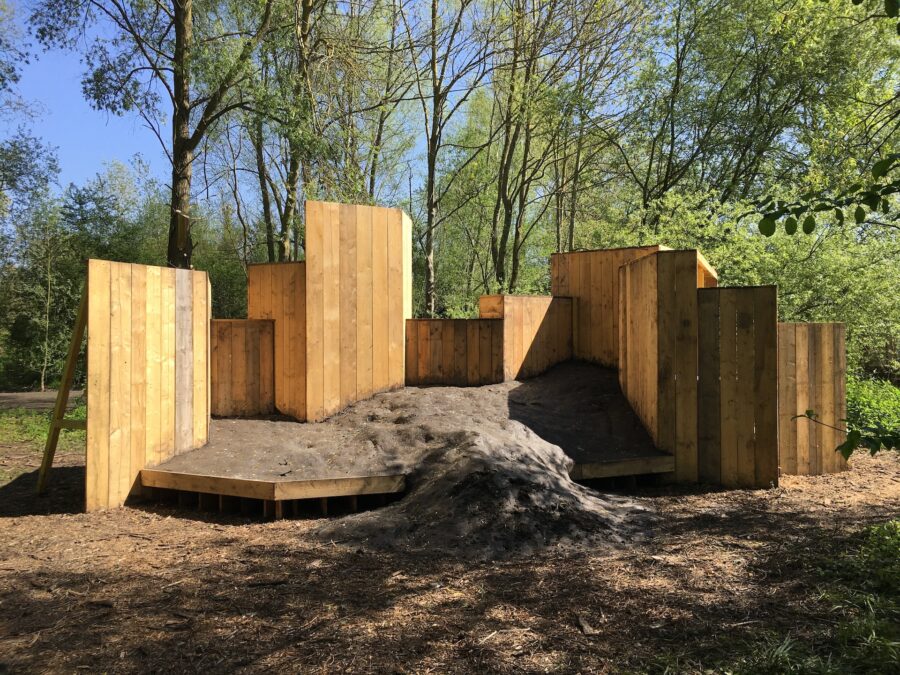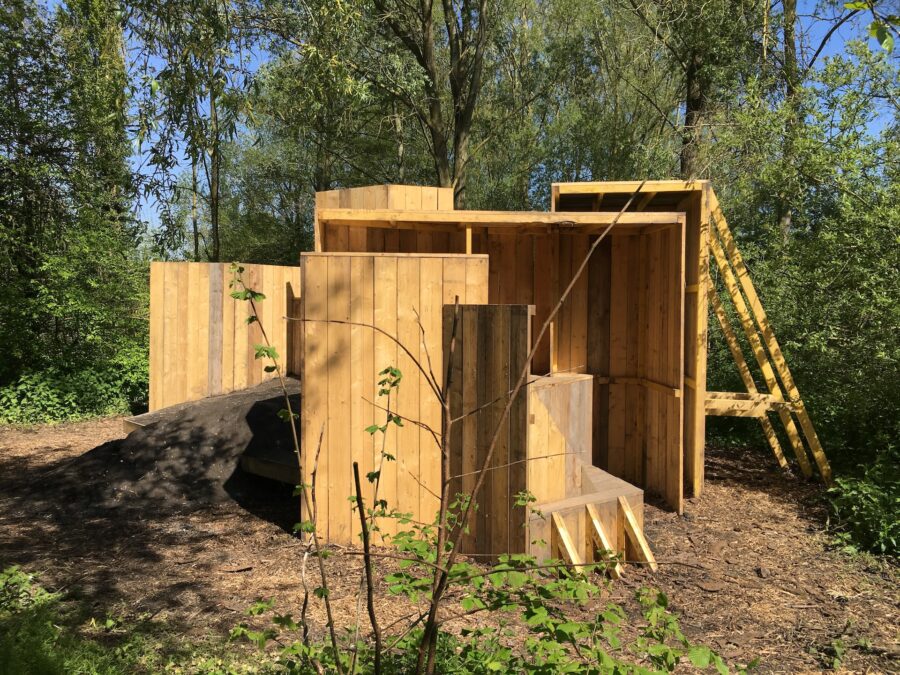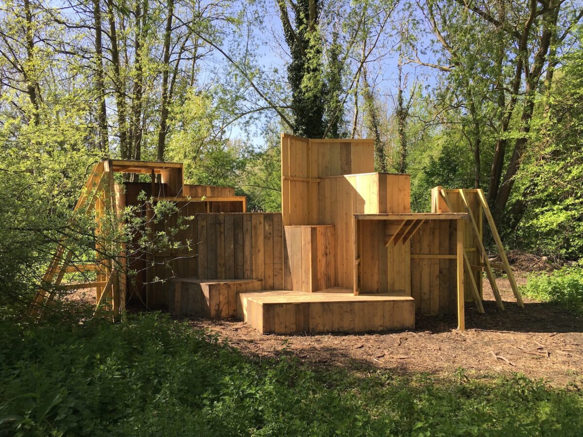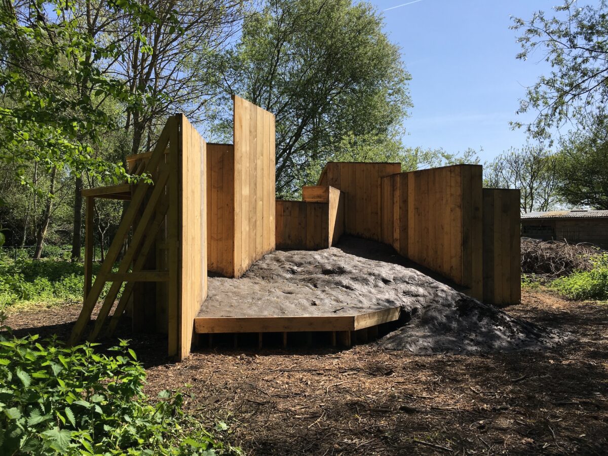 Construite en planches de coffrage, l’installation s’intègre aux hortillonnages comme une fabrique de jardin. Deux entités s’y confrontent : d’un côté un relief de vase disposé sur une plateforme qui le surélève légèrement du sol, de l’autre une construction de blocs amassés. Les deux matières semblent engagées dans des mouvements contraires, se repoussent mutuellement. Les forces qui caractérisent les hortillonnages, leur interdépendance ainsi que les différentes temporalités qui s’y succèdent, sont ici réinterrogées.