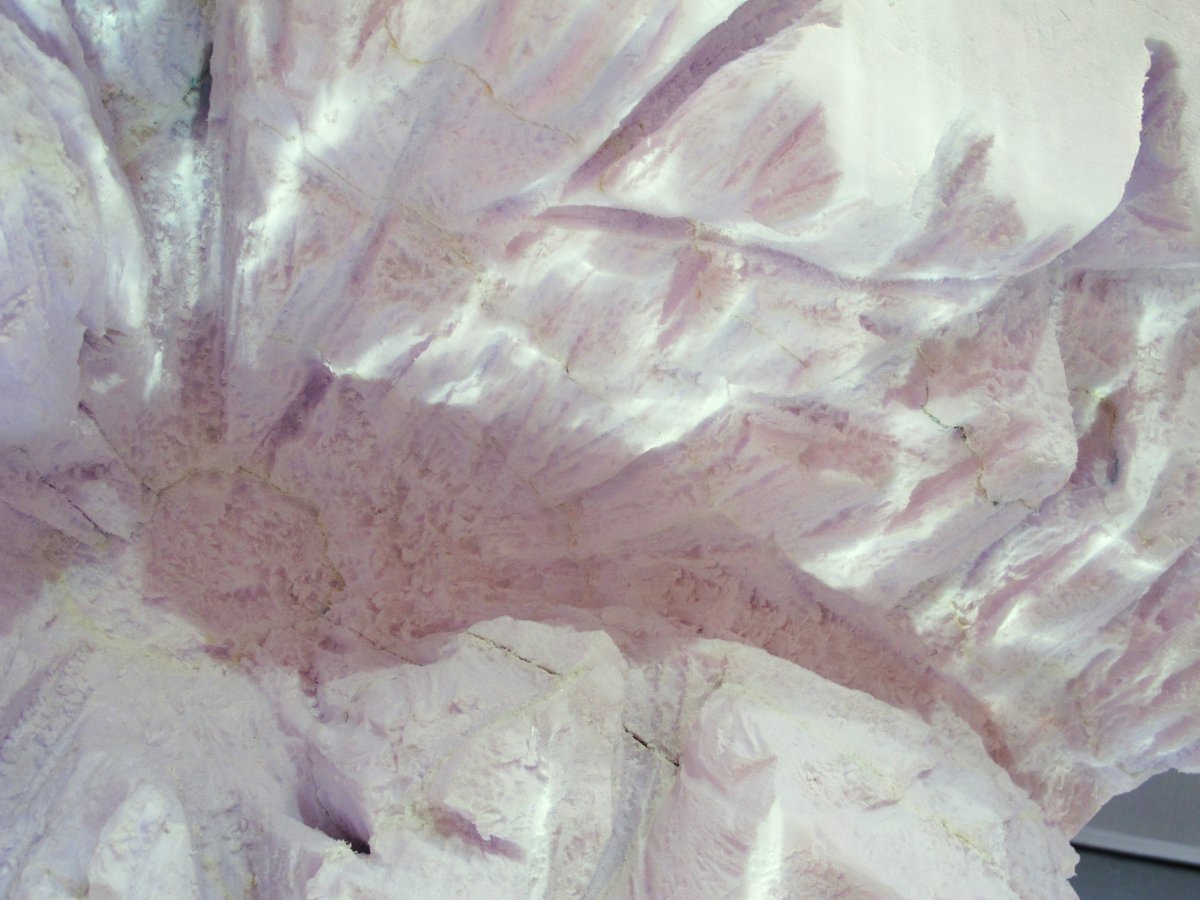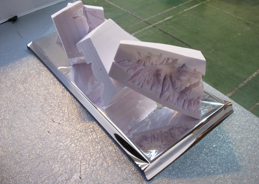 Une paysage de grotte a été sculpté dans une barque en polystyrène. puis la barque a été découpée en 4. Les morceaux sont pré- senté sur une feuille de miroir légèrement ondulant dans laquelle, ils se dédoublent et se troublent.