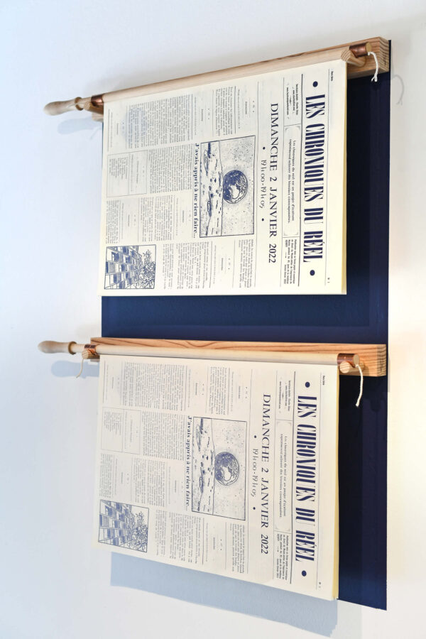 La Maison de Papier est l’exposition clôturant le temps de résidence de Charlie Chine et se déploie en deux lieux très différents. Le Musée-atelier assume sa dimension patrimoniale en accueillant, pour l’occasion, la version 6 du Métier à copier, spécialement conçue pour la résidence AZERTY, les planches du journal, ainsi que d’autres traces : gestes, matières, outils, comme les témoins de ce mois et demi de résidence.