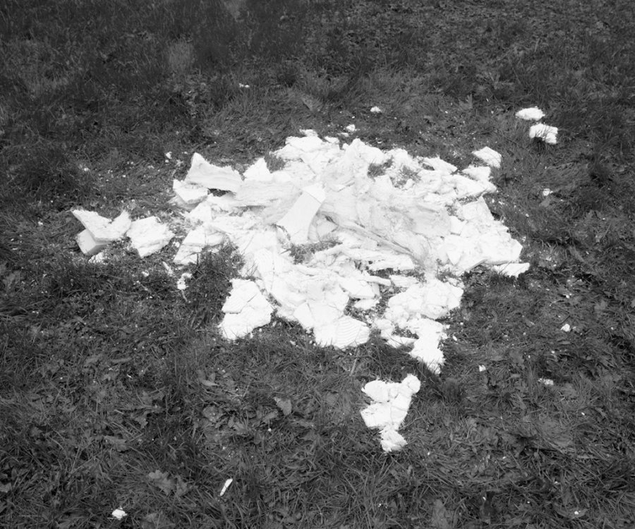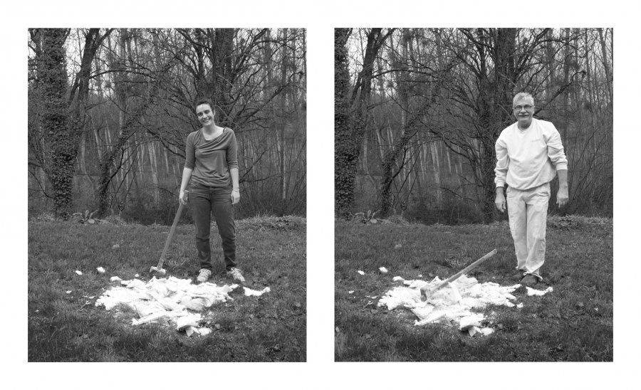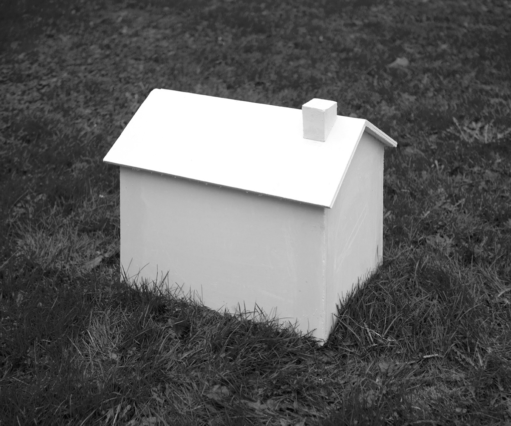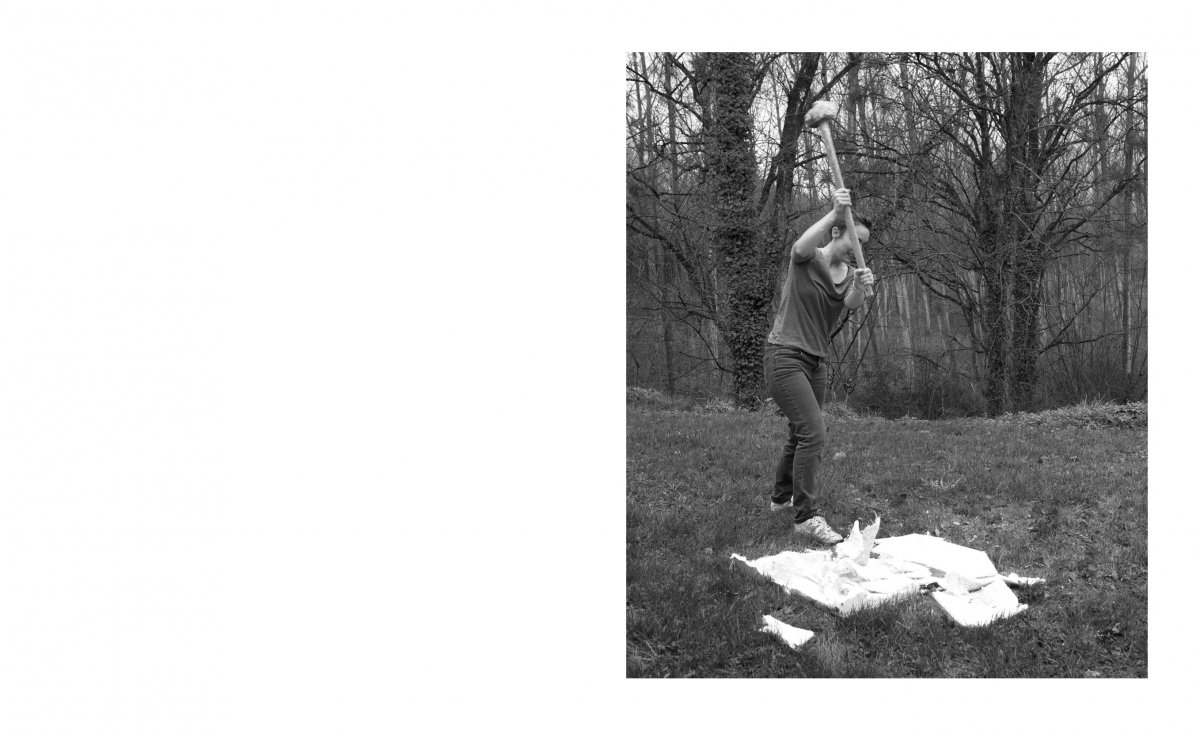 La forme de cette maison est simple et moyenne, elle pourrait ressembler à toutes les maisons, ou à celle de mon enfance, bâtie par mon grand-père. Elle est blanche et brute, comme un écran de projection pour nos désirs d’habitats. Elle ne résiste pas à mes coups de masse qui la dispersent et la font disparaître. Il n’en demeure que des images et une reproduction plus petite, que j’ai fabriquée.