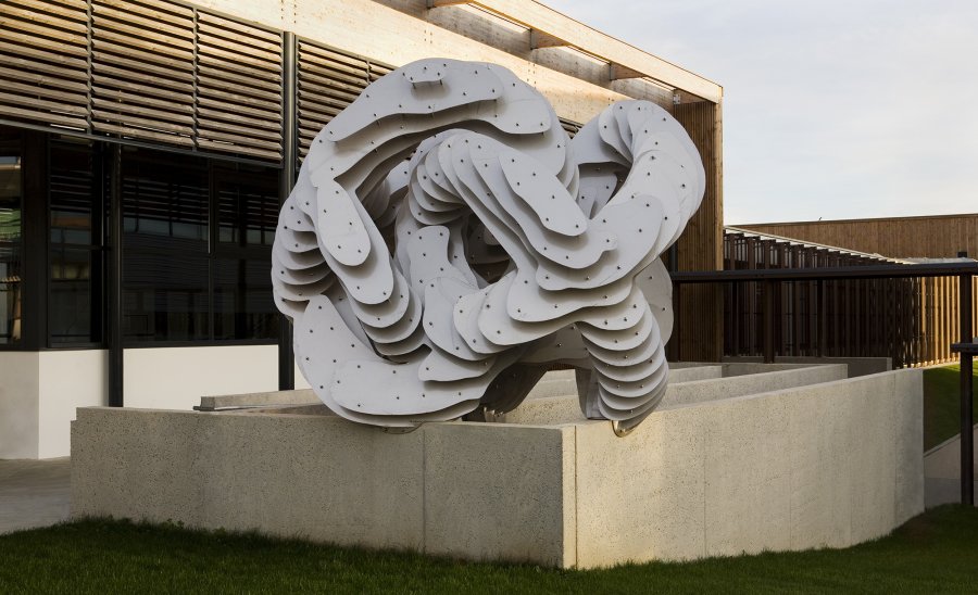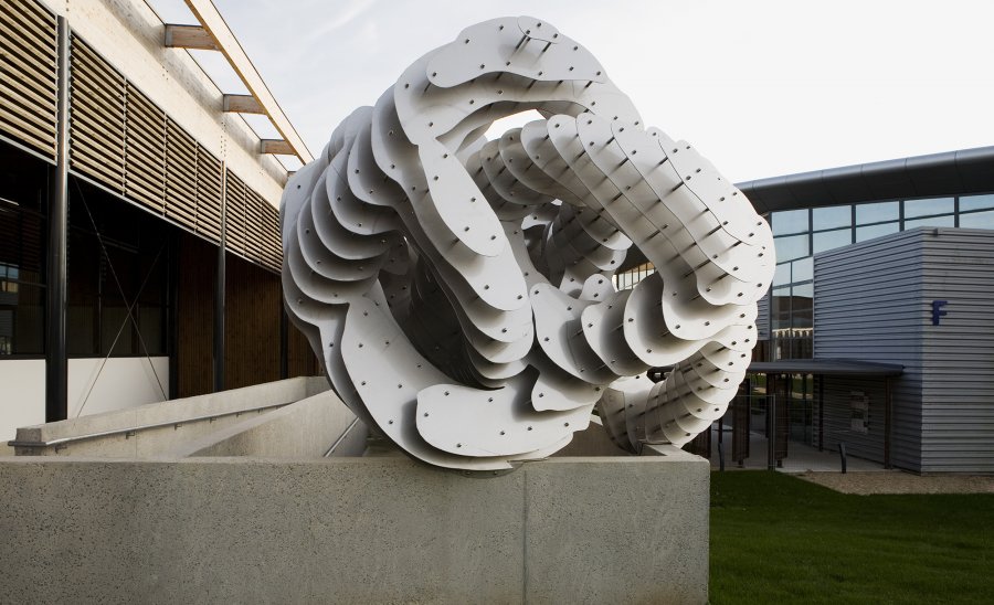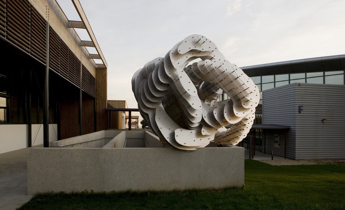 Dans le cadre du projet de cette commande artistique, j’ai conçu une sculpture créant, grâce au matériau employé pour la réaliser, un rapport visuel avec l’architecture des bâtiments et l’environnement proche.