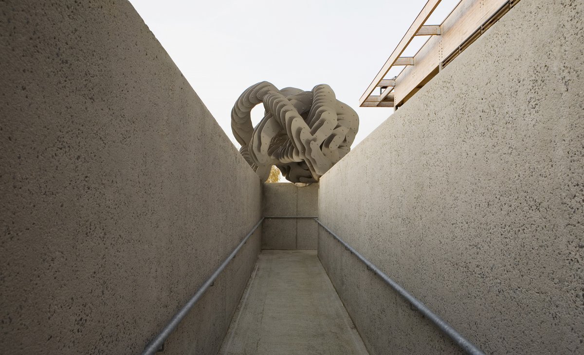 J’ai choisi de placer mon intervention au niveau du plan incliné permettant l’accès au bâtiment car cet élément utilitaire indispensable m’a interpellé par sa structure. En raison de la pente, la rampe se dessine en formant un chemin sinueux. Il m’a semblé intéressant d’animer cet espace avec une proposition en volume reprenant cette organisation repliée en méandre. Par ailleurs, cet emplacement permet de nombreux points de vue sur le volume créé ; notamment grâce à la possibilité de l’observer par dessous comme on peut le faire pour les ouvrages mécaniques.