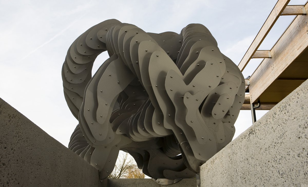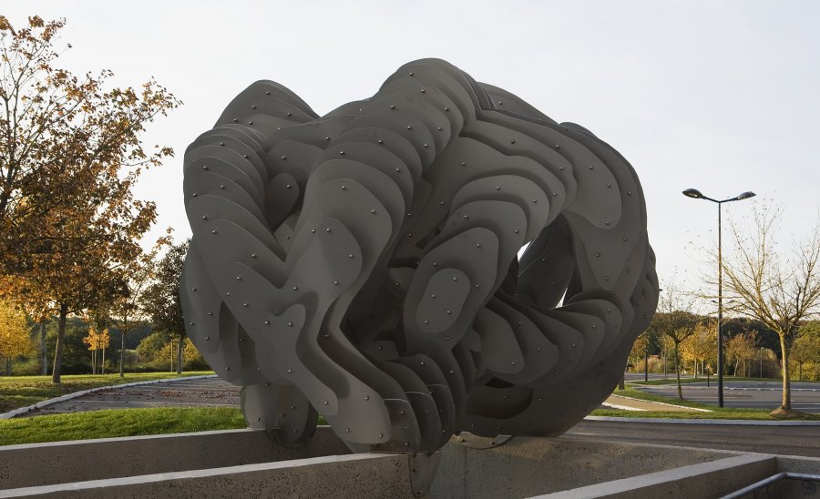 De façon plus générale ce projet est né de la synthèse de plusieurs images ou références purement visuelles. Il n’évoque et ne convoque aucune références spécifiques mais rappelle différents objets industriels, architecturaux ou mécaniques aussi bien que des formes naturelles ou façonnées telles que les noeuds. Il constitue en quelque sorte la synthèse plastique de ces différents éléments apparemment très opposés. Cette sculpture semble élaborée comme un produit usiné, conçu sur plan, telle une machine ou une structure. Sa forme globale est produite par l’assemblage de différentes plaques découpées reliées ensemble par de nombreuses tiges métalliques parallèles. L’objet semble donc construit comme un volume complexe d’aspect naturel à l’origine, qui aurait été découpé en tranches fines régulièrement espacées et écartées, maintenues en place dans l’espace; une forme sophistiquée non identifiable qui aurait été analysée et reconstruite d’une façon schématique. Cette structure composée de lignes droites parallèles et de lignes courbes régulières forme dans l’espace un dessin proche d’une étude technique ou d’une forme 3D. La sculpture ne peut tourner sur elle-même comme sur un écran mais, évoluant autour, le spectateur peut songer à ce type d’univers virtuel.