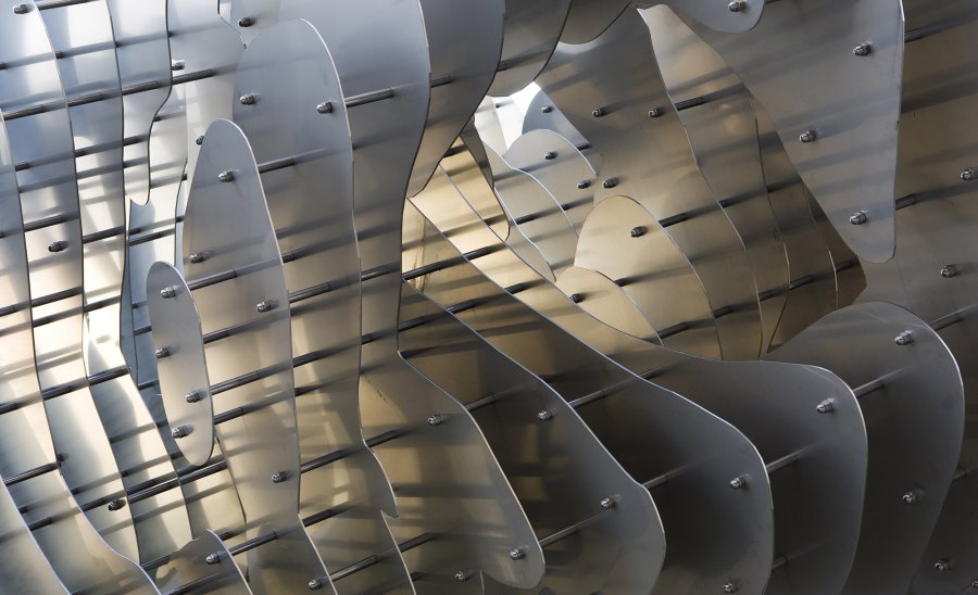 Lorsque l’on observe plus attentivement la sculpture et que l’on s’attache au choix des matériaux, l’inox et l’aluminium composant la forme évoquent paradoxalement, un univers loin de ces espaces virtuels. Les métaux produisent ainsi un objet brut, très réel, dont la fabrication semble avoir été dépourvue de préoccupations esthétiques, optimisé pour un usage ou dans un but impossible à identifier. Ces matériaux sont utilisés sans artifice, ni traités, ni peints, laissés apparents, ils donnent à la construction un aspect inachevé d’objet en cours de montage, de moteur désossé. L’ensemble se perçoit comme une ossature, comme le coeur d’une forme indéfinie. Les sciences s’évertuent à chercher et à trouver des schémas et des modes de représentations simplifiés de la nature et de ses phénomènes afin de permettre de nous les représenter mentalement ; nous ne pouvons appréhender notre environnement dans sa complexité sans ces formes modélisées. Cette structure peut s’identifier à une matérialisation, une concrétisation de ce type de schéma, un croquis extrait d’une forme minérale ou organique.