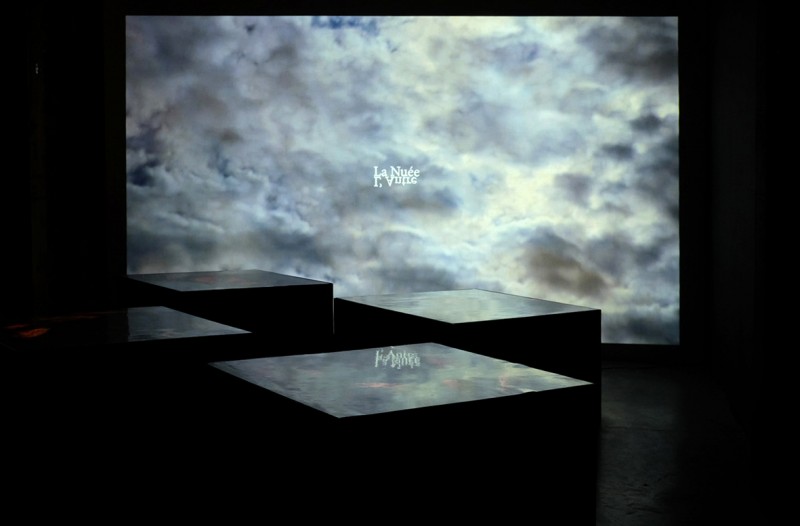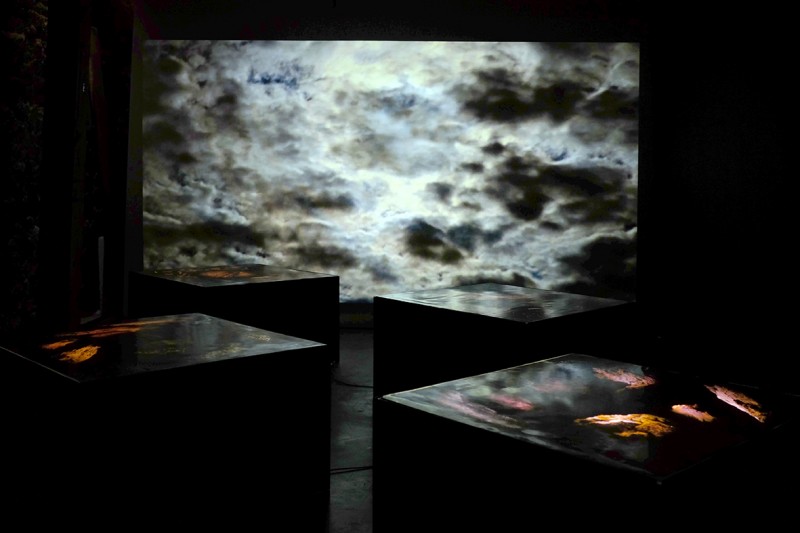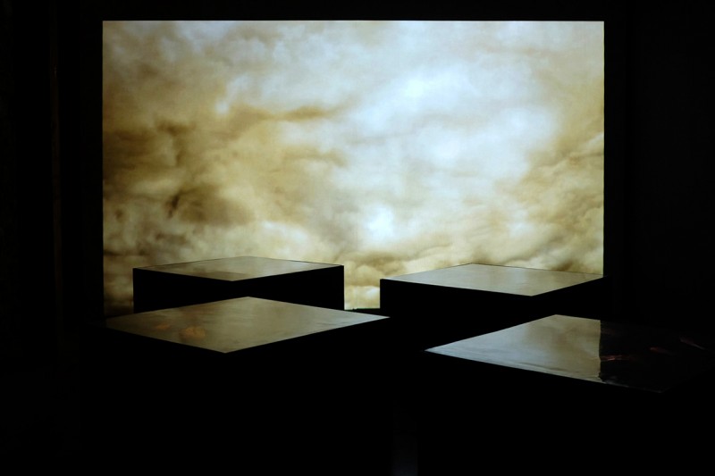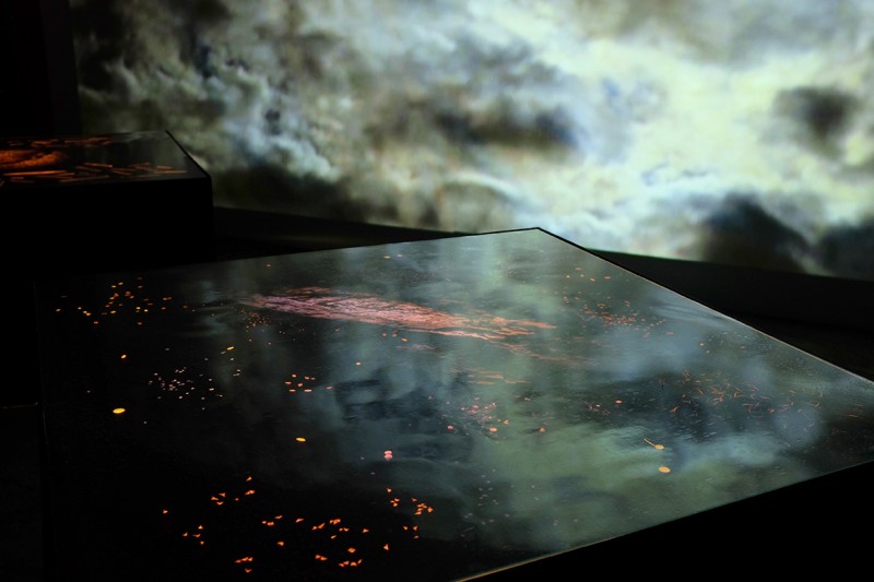 Vidéo-projection et installation de photographies en caisson lumineux avec verres soufflés 55 × 88 × 81 cm