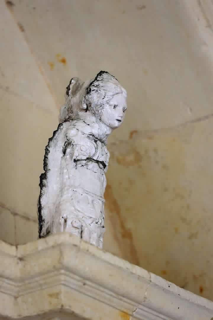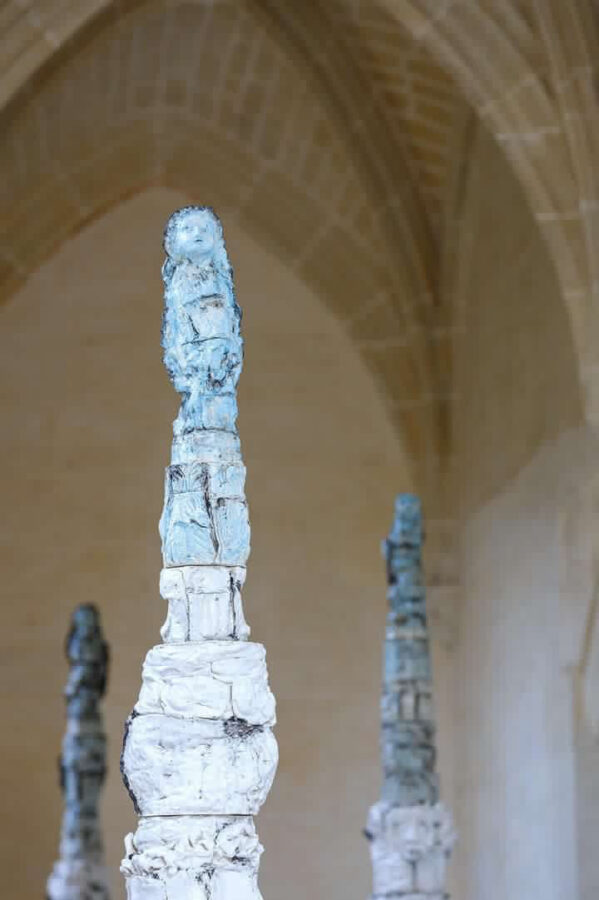 J’ai imaginé un ensemble de sculptures – pièces XXL d’un jeu imaginaire – composées de modules empilés en céramique blanche et noire évoquant à la fois le carottage d’un sol, les colonnes présentes dans l’enceinte de l’abbaye ou le lapidaire de la Madeleine. Ces modules, ces socles, servant de piédestal à autant de sculptures figuratives en céramiques bleues – présences hybrides, étranges, oniriques – évoquant à la fois les abbesses et les prisonniers lorsque le lieu était une prison.