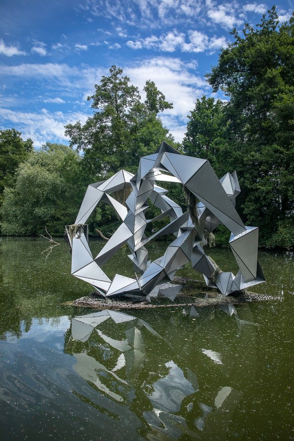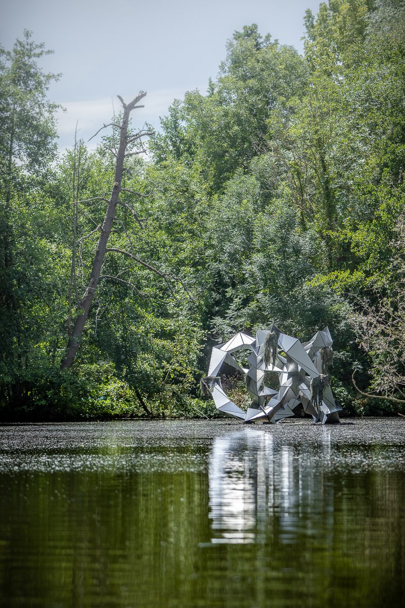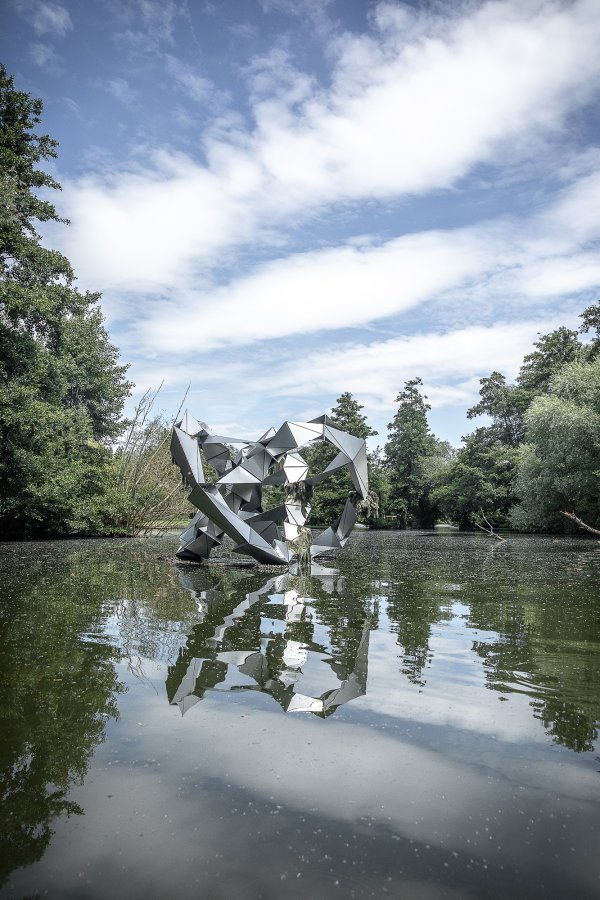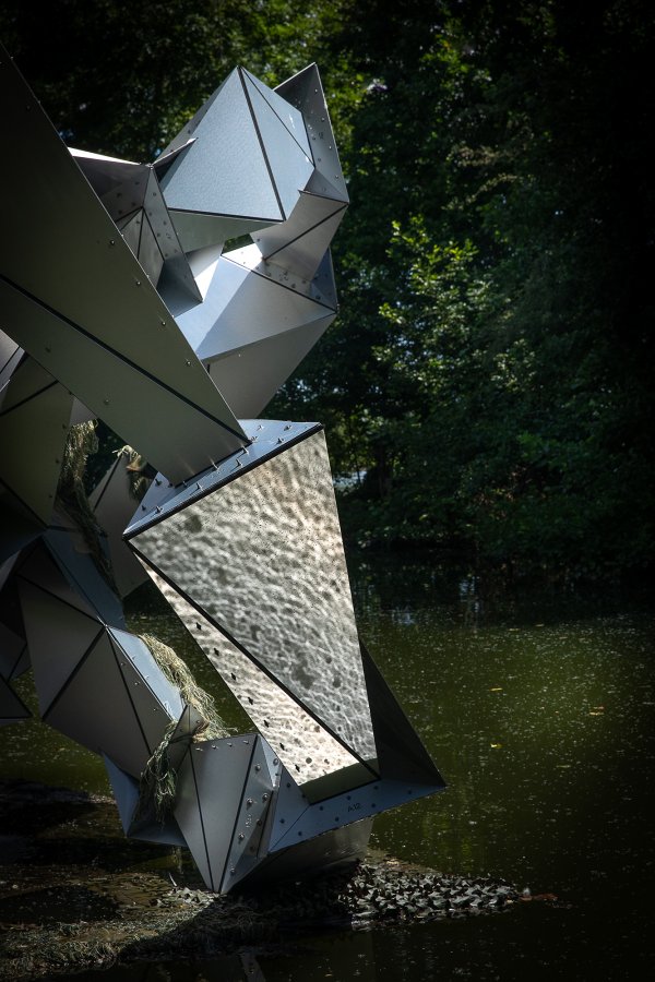 Posée sur l’eau, la sculpture de Vincent Mauger se déplace et oscille légèrement. Le spectateur, en évoluant autour, peut songer à un objet irréel, une représentation numérique glissant sur un écran.