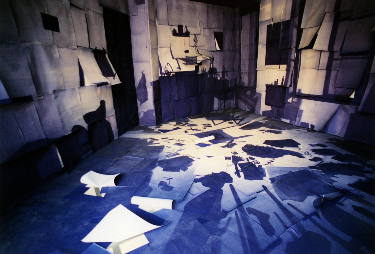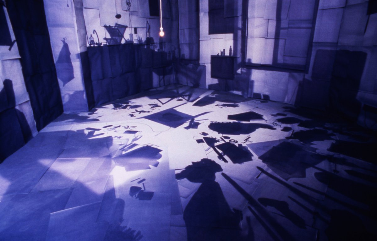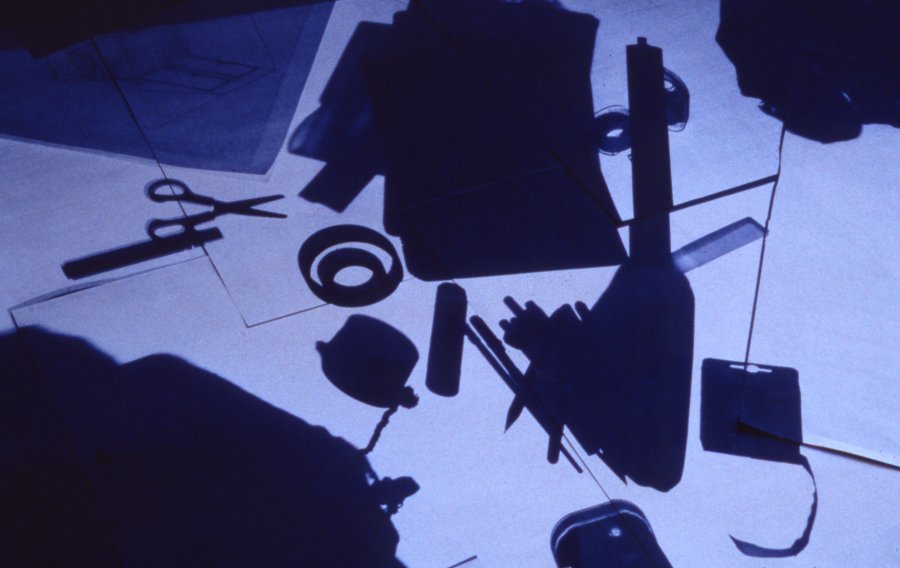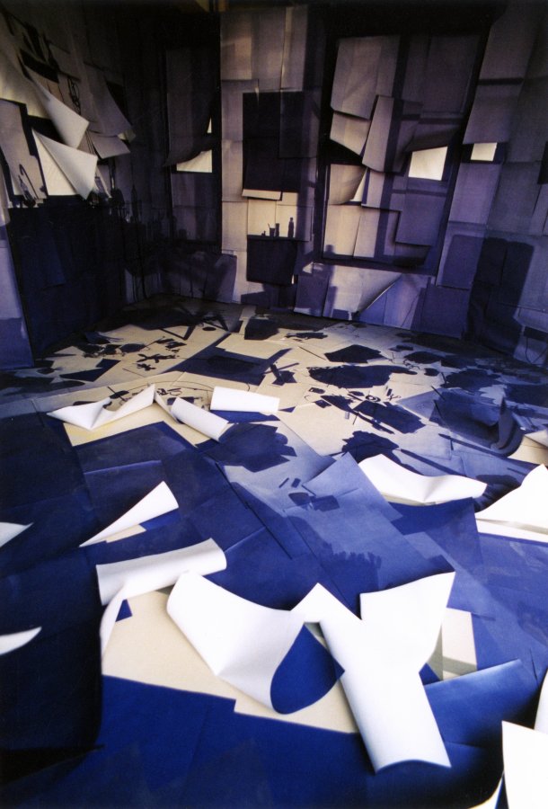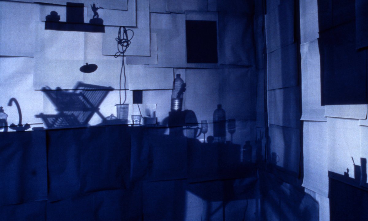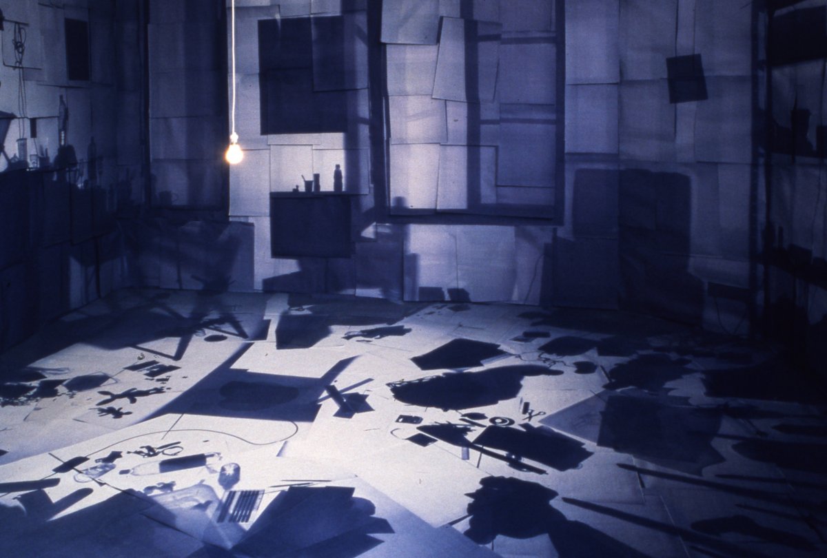 Dans une installation réalisée en juin 1999, j’ai construit une structure pour reproduire à échelle identique l’espace de mon studio d’étudiant, lieu privé et intime. Dans ce décor, vide de tout meuble, seules les ombres des objets sont présentes. Les murs sont recouverts de papier photosensible (diazographique) exposé auparavant dans la pièce originale. Le papier a donc fixé l’empreinte de tout le mobilier.