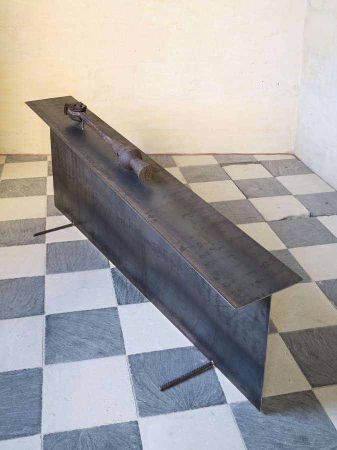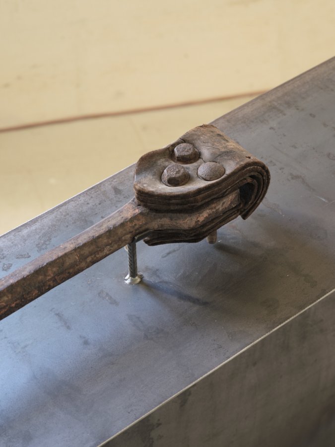 matière brute, l’acier. Il est mis en scène dans un dispositif muséal. A portée de main du visiteur, le toucher