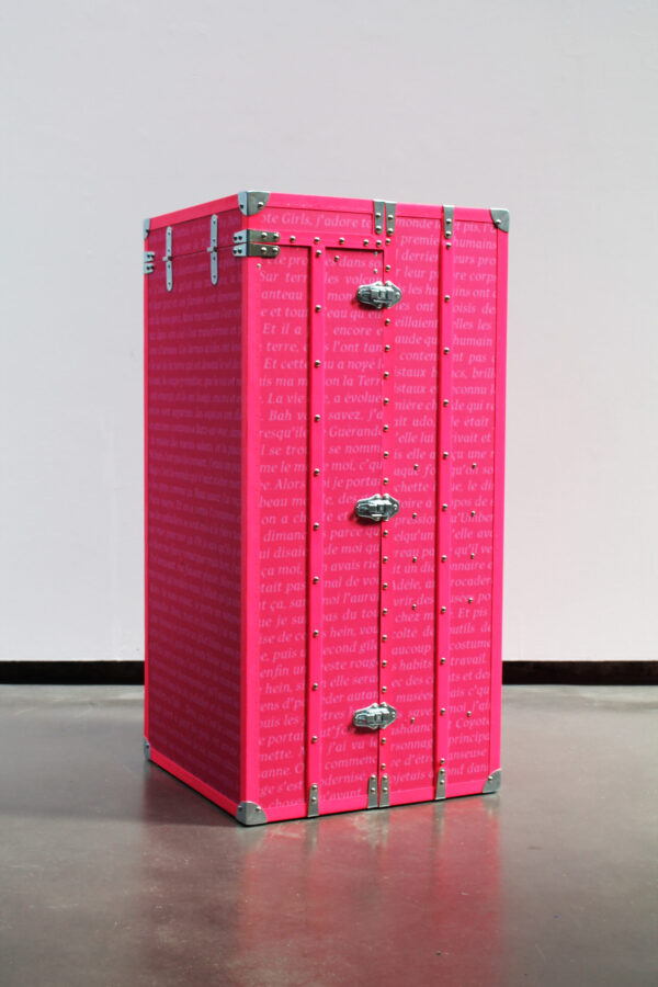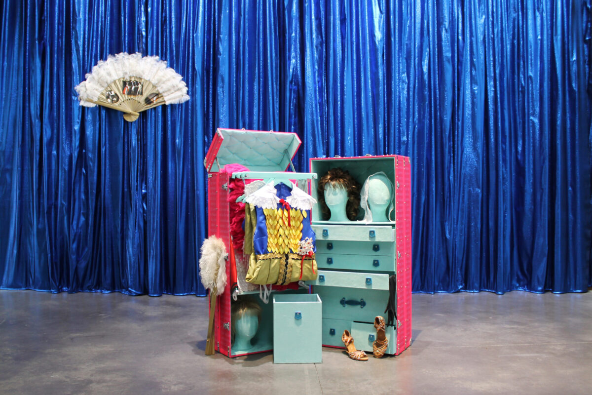 Cette malle renferme dans son écrin bleu tous les costumes et accessoires de la performance C’est fin comme du gros sel ! On peut ainsi y voir une paire de gants, des chaussures,  une robe avec son col en dentelle, des perruques. D’autres élements sont seulement aperçus : une chemise, un corset, des collants… Le reste est inaccessible, enfermé dans les tiroirs attendant l’arrivée de la performeuse pour être enfilé. Sur l’extérieur rose, on peut lire les histoires racontées pendant la performance.