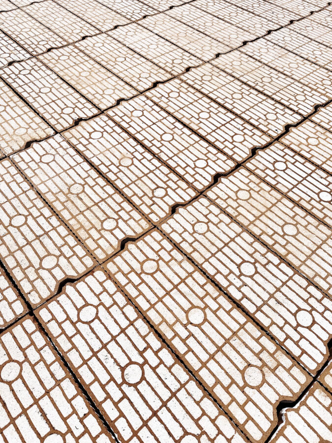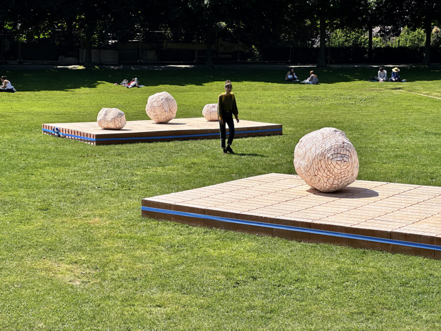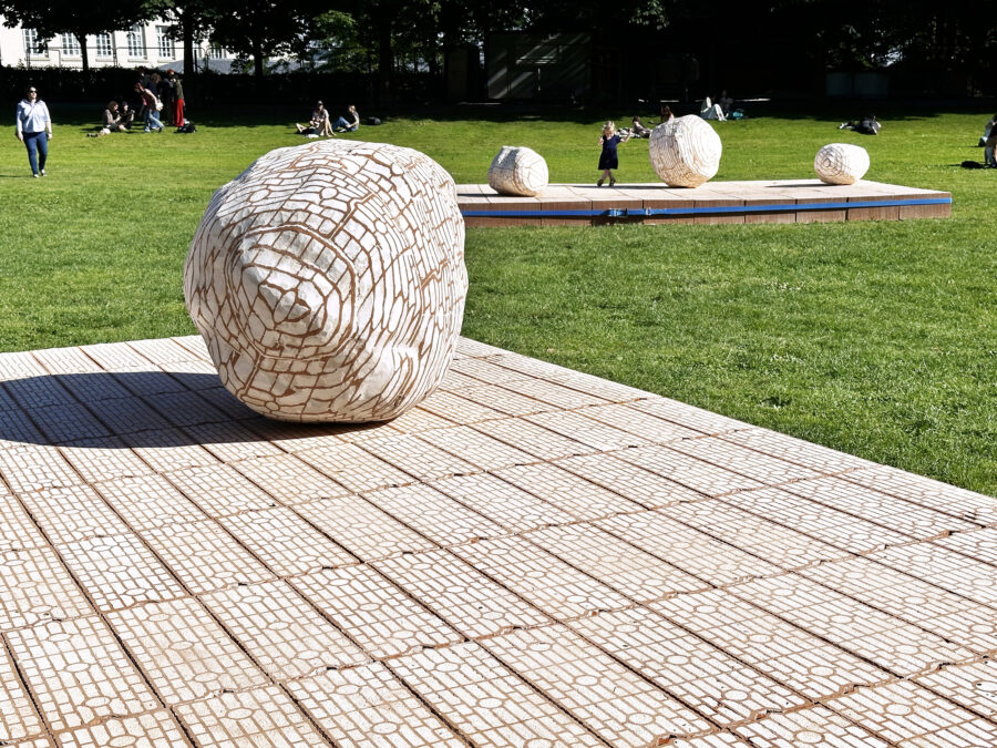 Avec cette nouvelle sculpture monumentale composée de plusieurs tonnes de briques en terre cuite, Vincent Mauger continue d’explorer le potentiel sculptural et graphique des matériaux de construction. L’œuvre semble une incursion dans le parc d’un objet tout droit échappé des espaces numériques d’ingénierie 3D venue se poser momentanément dans un écrin de verdure.