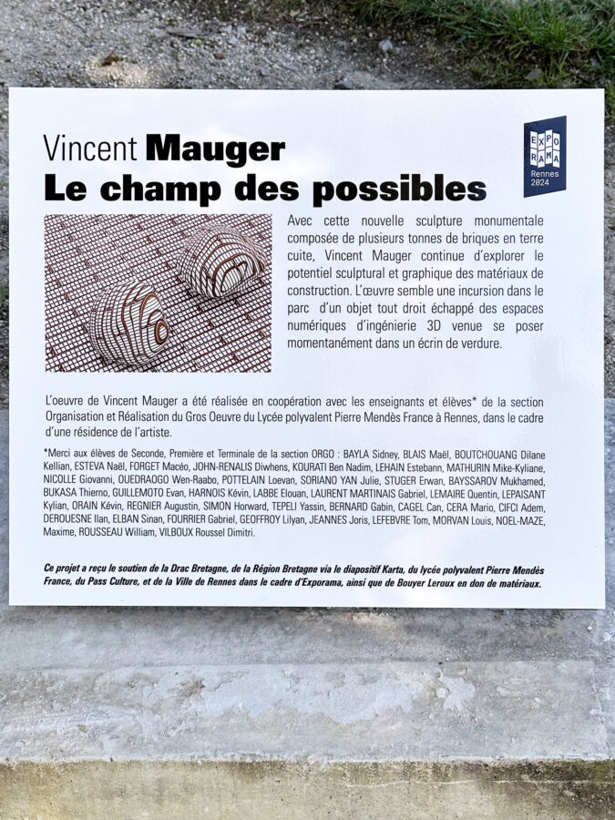 Cette nouvelle sculpture de Vincent Mauger a été créée en coopération avec les enseignants et élèves de la section gros œuvre du Lycée polyvalent Pierre Mendès France à Rennes, dans le cadre d’une résidence de l’artiste.