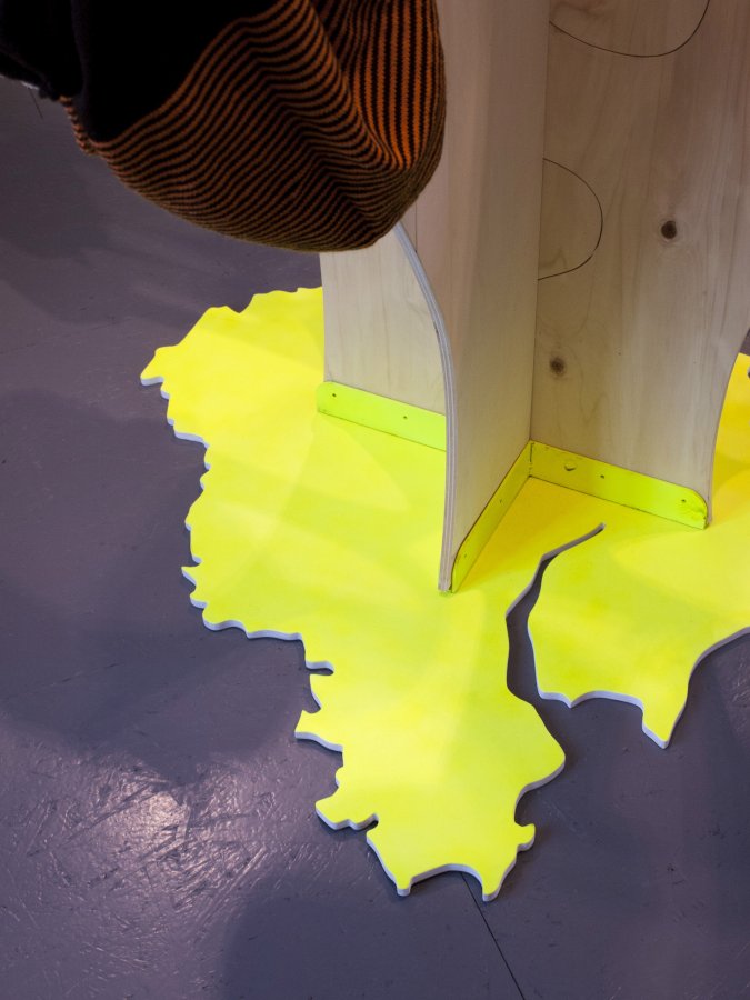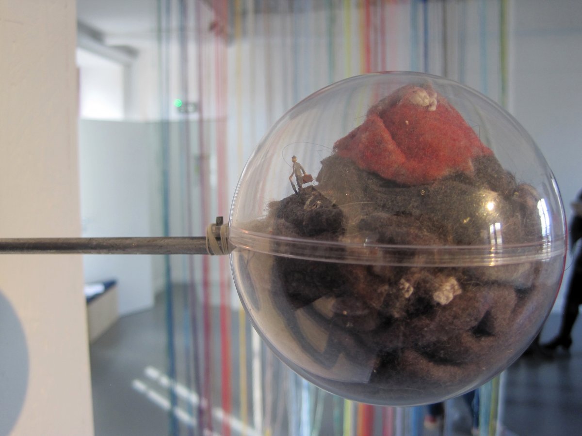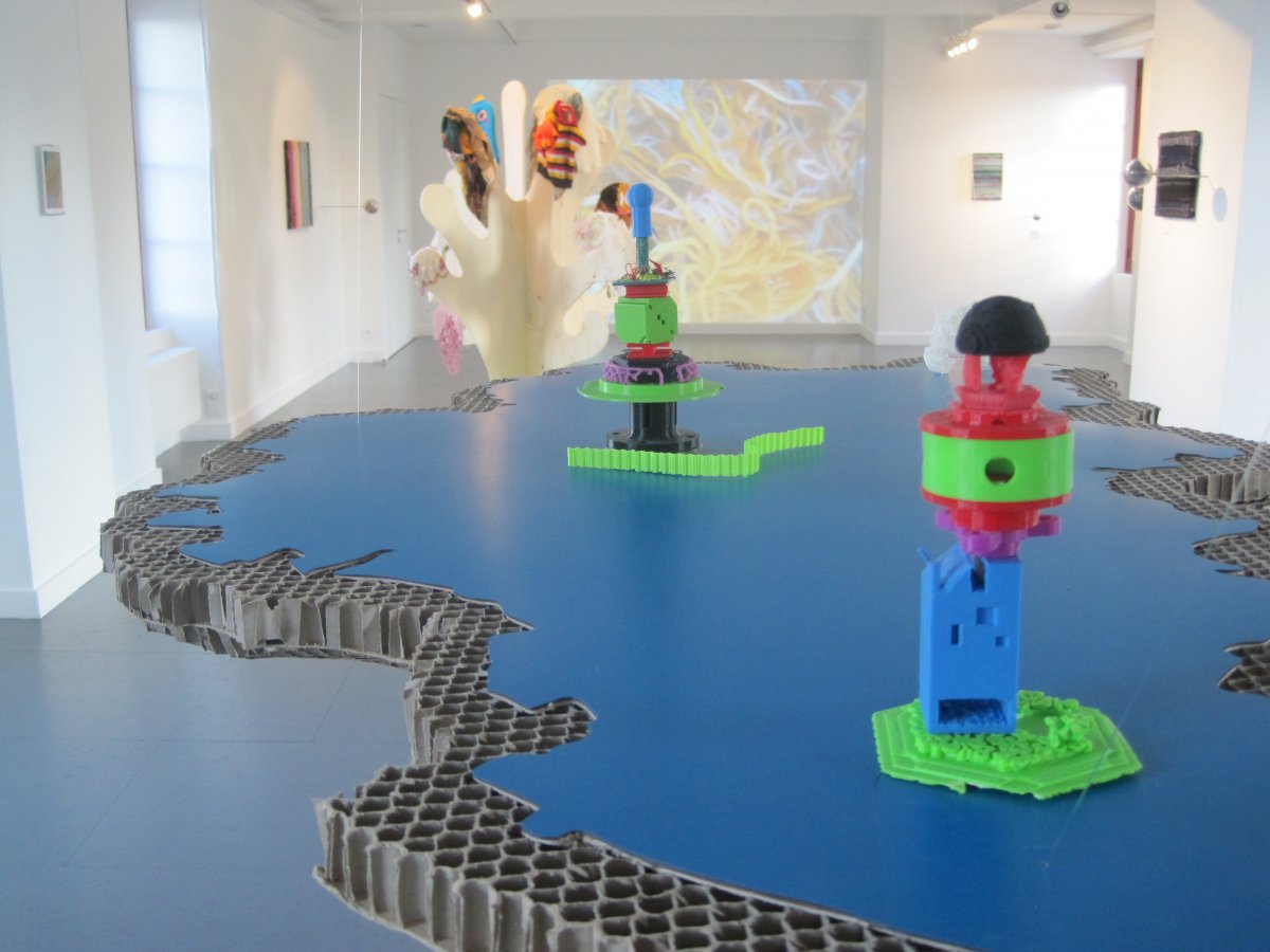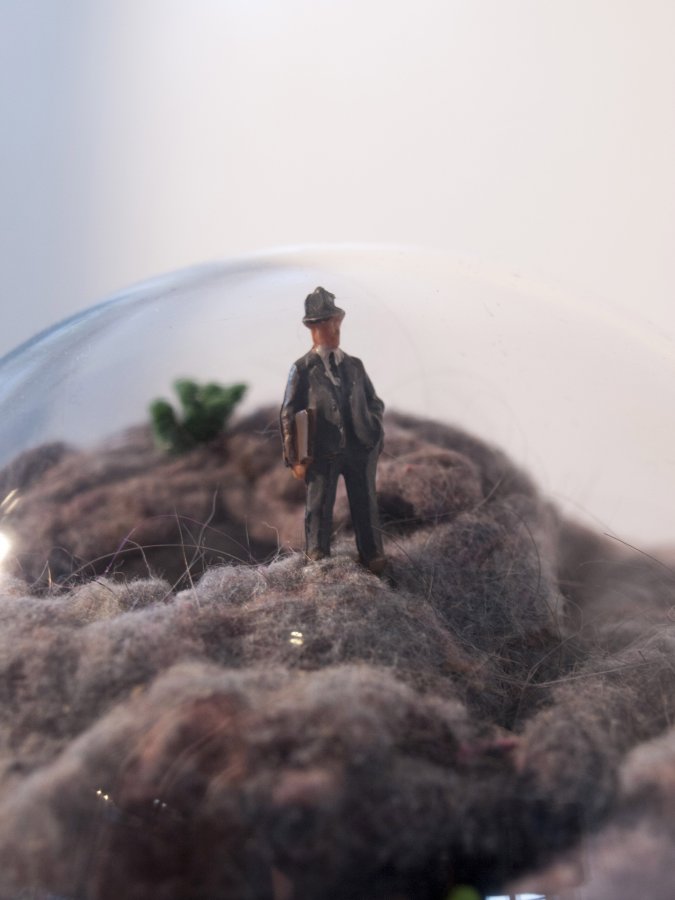 Sont données à voir : le journal de curiosités, séries de cadres installés autour d’un fil, ensemble de dessins automatiques mêlés de diverses curiosités ; les petits mondes, bulles de paysages en poussière de sèche-linge ; l’arbre à cagoule : des restes transmis par les habitants sont nées des cagoules posées sur une sculpture arbre ; l’île : géographie contrecollée sur carton alvéolé et sculpture de restes d’imprimantes 3D.