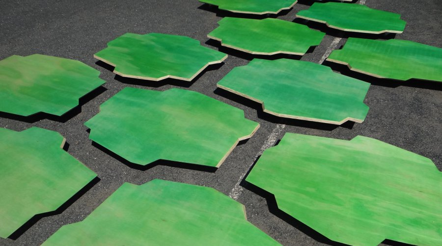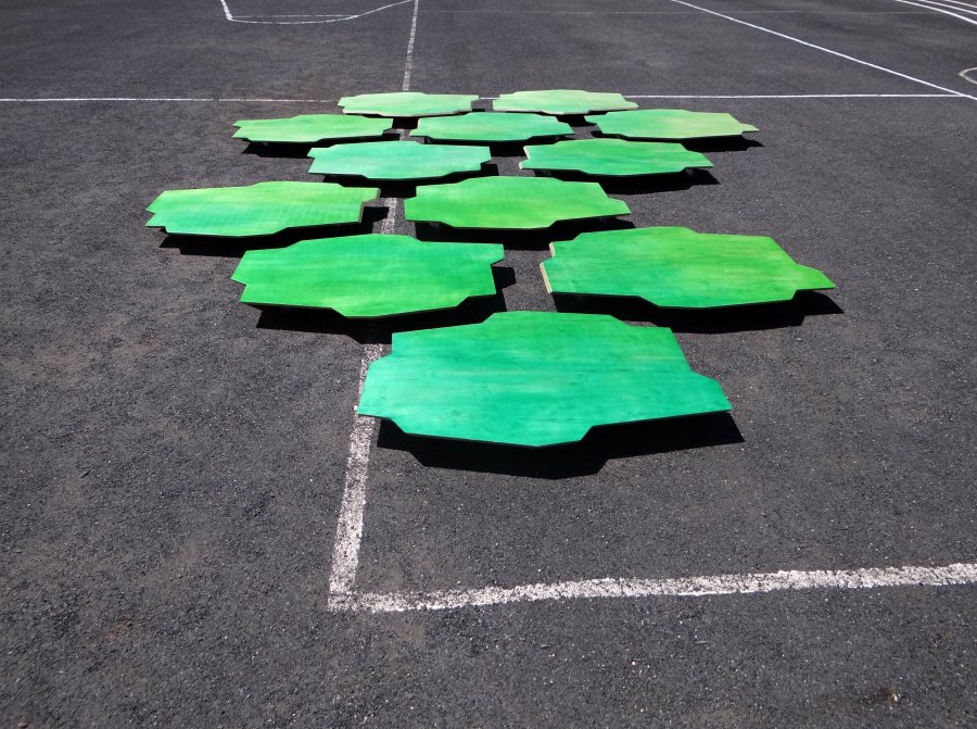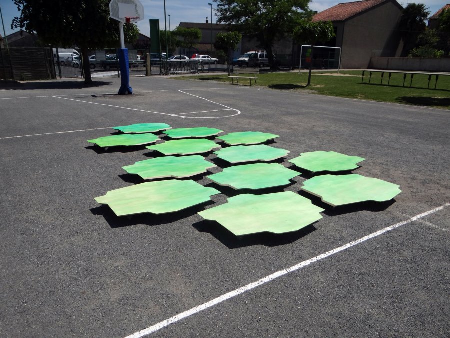Ni vraiment de la sculpture, de la peinture, ou encore de l’installation et un peu de tout ça à la fois, Le grand écart se compose de 12 planches de bois biseautées, peintes à l’aquarelle en dégradé, fixée sur roulettes. Sorte de nénuphars mécaniques pouvant faire référence aux Nymphéas de Monet ou encore à des planche de skate board.Le Grand écart abaisse tout d’abord littéralement le regard et bouleverse le système de reconnaissance des formes par un jeu de distanciation.C’est une manière d’envisager de façon ironique les références à la fois à la culture populaires mais aussi aux modernes et à la fascination qu’ils génèrent. Mais aussi et surtout, de suggérer et de développer un niveau de sens supplémentaires.