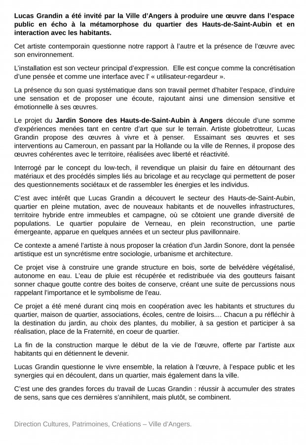 Dans la continuité des jardins Sonores de Douala, Sao Tomé ou Nantes, un nouveau Jardin Sonore commence a germé…Angers résonne ma tête comme « La ville végétale »…Autant pour ses pôles économiques d’agriculture et d’horticulture que par son climat doux favorable à tant de végétation. Les Hauts-de-Saint-Aubin, quartier d’Angers en pleine mutation, d’abord agricole, ensuite zone populaire urbanisée par de grands ensembles, se tourne aujourd’hui vers un le projet de quartier à haute qualité environnementale.