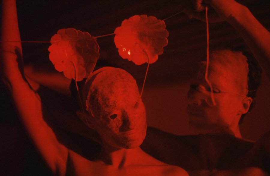 De la prise de vues à la prise des corps. Des corps qui appellent le regard, mais aussi l’envie qui les change. Lorsque Laurent Moriceau présente sa « chambre éphémère », dispositif conçu sous lumière inactinique1, il invite chaque fois d’autres créateurs afin que ceux-ci s’approprient l’espace qu’il propose. « Le perméable » de 1995 accueillait déjà la présence d’une collaboratrice artiste. Plus tard, il fera appel au styliste Elian Lille, puis à d’autres. Il organise des boutiques de confection vestimentaire, des défilés. Récemment, au Japon, il sollicite les visiteurs à prendre des bains de lumière rouge. Pour cette exposition Micha Derrider est l’artiste styliste venue initier des baigneurs envoûtés par la lumière rouge.