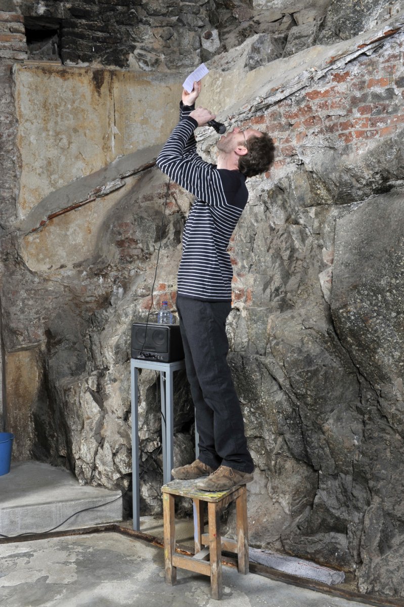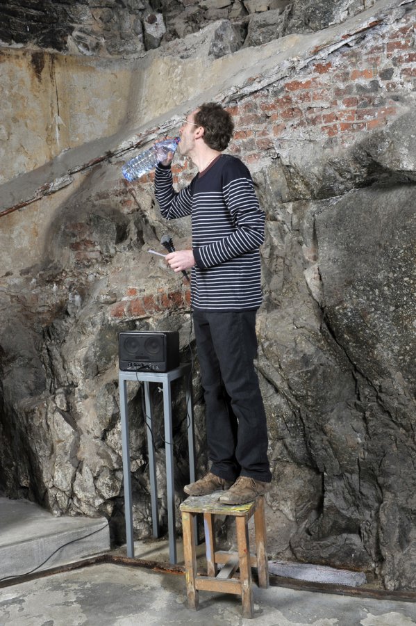 Jean Bonichon, silhouette élancée, grand blond flegmatique aux chaussures usées, se lance dans son étrange et inconsolable plaidoyer. Peu intimidé, un micro à la main gauche, une bouteille d’eau à la main droite, perché sur un petit tabouret, l’artiste fait chuter le liquide insipide dans sa cavité buccale comme s’il y avait un brasier, tête renversée pour mieux la noyer. A ses cotés, un haut socle métallique accueille sa bouteille plastique, avec un petit ampli posé à ses pieds, chaque diction laissant échapper une coulée de diarrhée sonore. Entre chaque rasade, un temps de silence que personne n’ose troubler, c’est lui qui rythme le chant de sa logorrhée.
