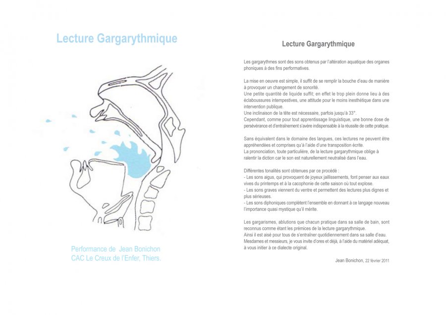 Lecture Gargarythmique : crée en 2008 pour le pavillon des sources du CAC Parc Saint Léger pour les petites formes concertées: Garden Party, ré-activé pour Les Enfants du Sabbat XII.