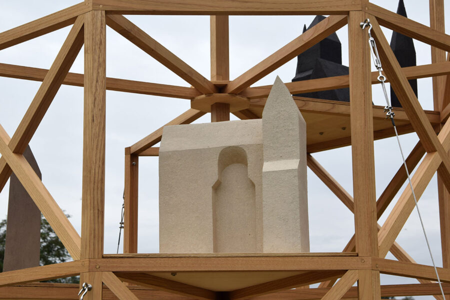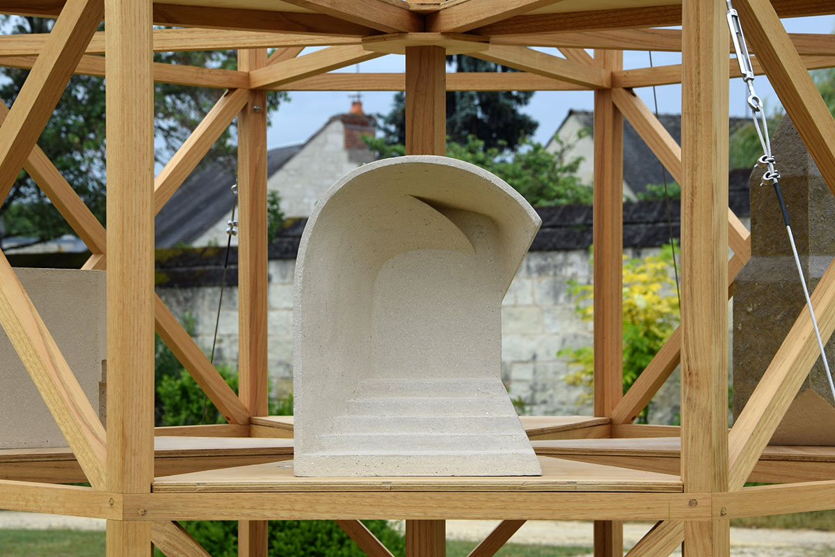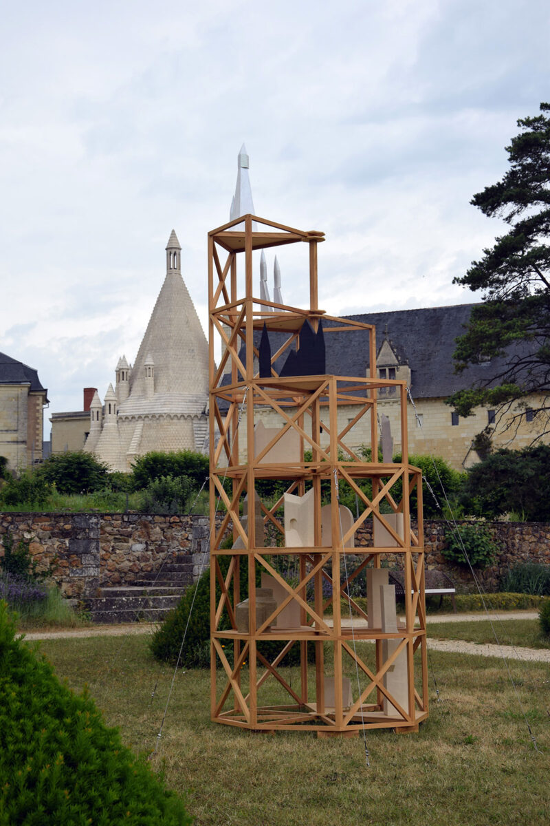 Dans l’hypothèse où le site aurait pu être un lieu de pèlerinage (si la volonté du fondateur de l’Abbaye d’être inhumé parmi ses semblables dans un lieu commun à Fontevraud avait été respectée), j’ai imaginé une forme d’édifice pouvant être à la fois une architecture funéraire, une lanterne des morts, un échafaudage ou une simple tour. Ce monument est pensé comme une structure s’articulant sur la base de l’octogone, une figure géométrique que l’on retrouve dans plusieurs éléments architecturaux de l’abbaye, notamment les cuisines romanes, les flèches et les tourelles. Dans la symbolique chrétienne, cette forme est reliée à la croyance d’un autre espace temporel qui marquerait une forme d’éternité.