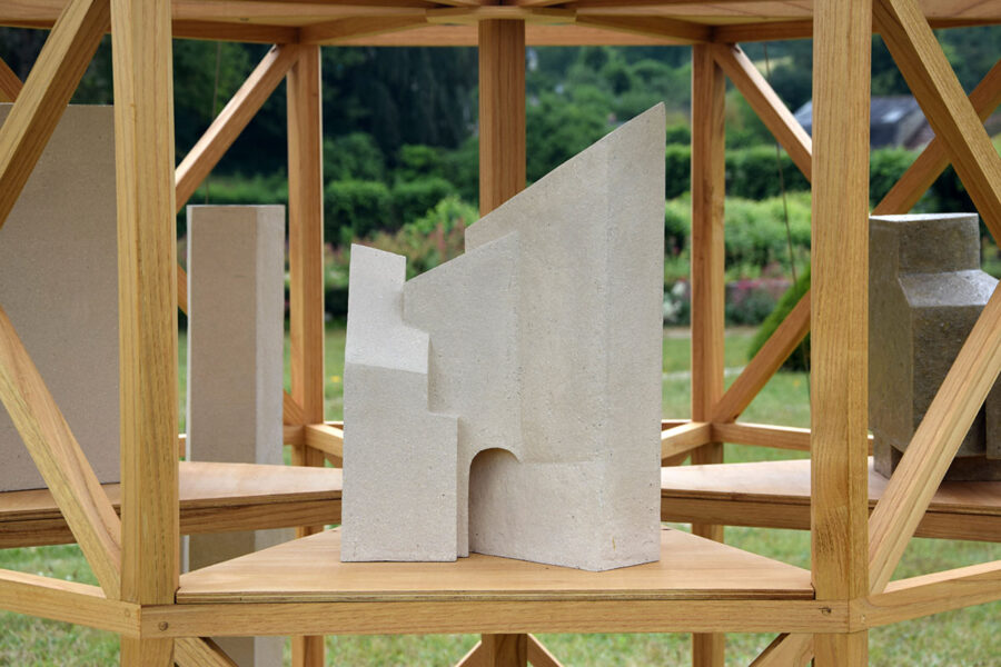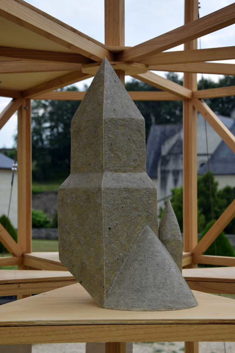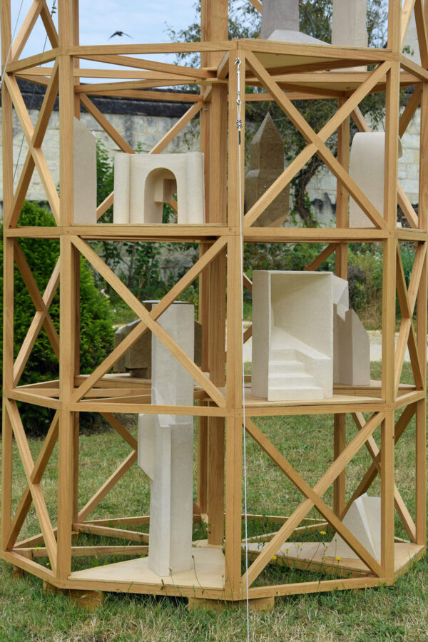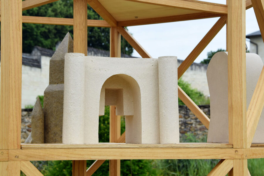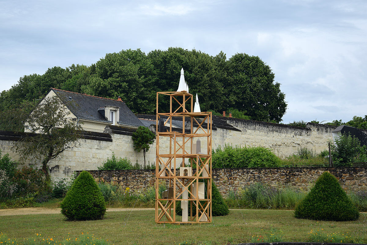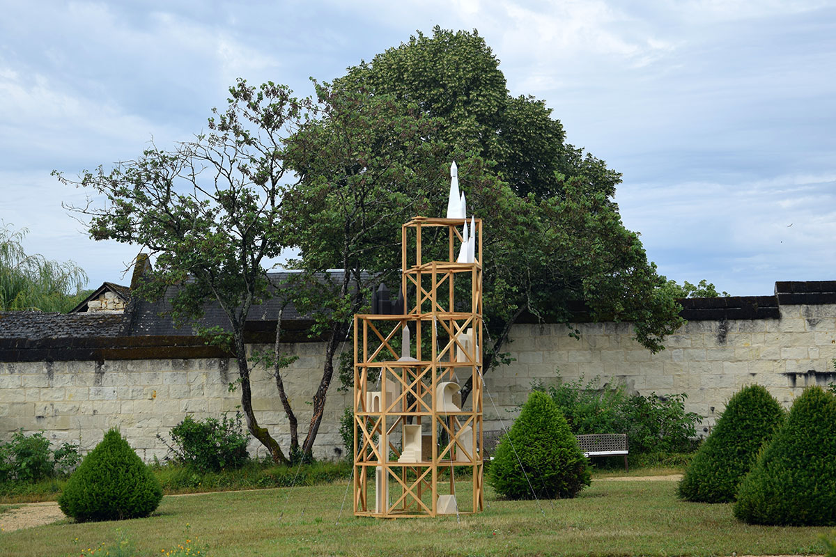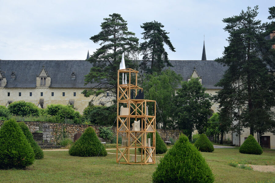 J’ai choisi d’habiter cette construction de plusieurs sculptures en céramique. Réalisées à partir d’un travail de collecte photographique puis de dessin, elles peuvent être issues d’éléments partiels ou entiers. Elles sont autant d’indices convoquant différentes échelles et plusieurs points de vue pris de l’Abbaye de Fontevraud, m’ayant intriguée par leur particularité. La plupart d’entre elles conservent un aspect brut qui rappelle le tuffeau, la pierre locale. Les sculptures les plus hautes possèdent un revêtement opalescent évoquant la nacre, un matériau employé dans les usines par les prisonniers confectionnant les boutons durant l’époque carcérale de l’Abbaye. Placées au plus haut de la structure, elles en sont le fanal. D’autres situées plus bas sont recouvertes d’un émail fait à base d’argile sédimentaire verte récoltée dans la forêt de Fontevraud à l’occasion d’une randonnée, s’inspirant du voeu de Robert d’Arbrissel d’être «enterré dans la boue de Fontevraud». La sculpture noire reprend la sombre silhouette des toits de l’abbatiale que je contemplais dans la lumière du levant depuis la chambre dans laquelle je logeais, située au-dessus de la porte d’entrée.